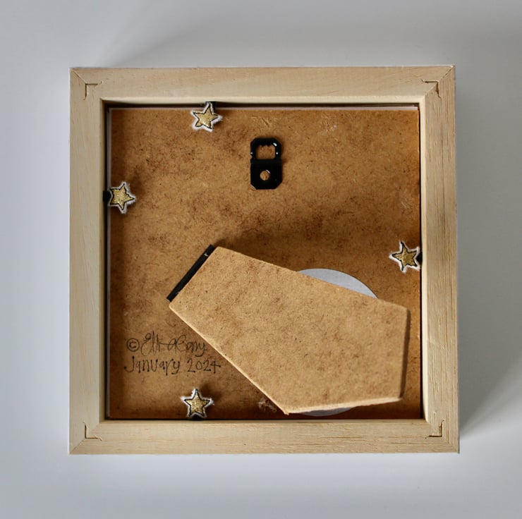 Encapsulated within a white washed box frame, measuring 15.5cm by 15.5cm.