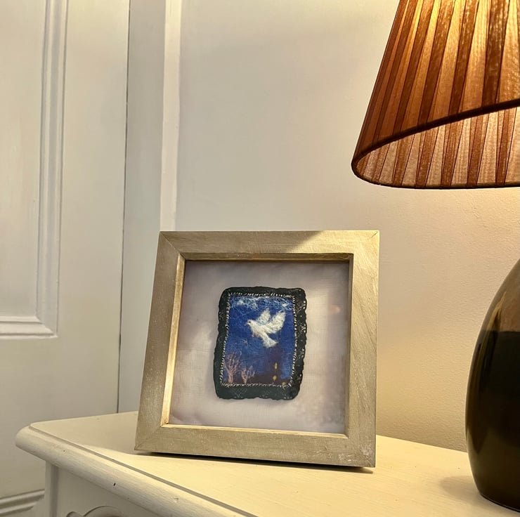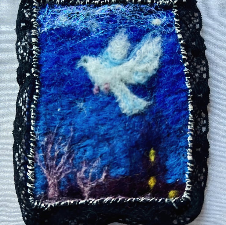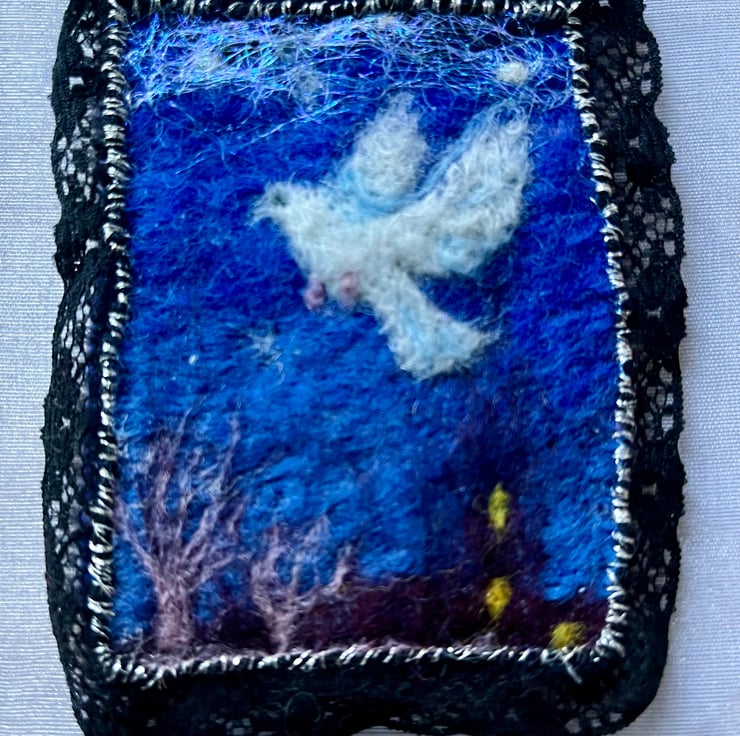 A dove flies over a night-time landscape. This unique little artwork has been wet and needle felted in merino wool with added sparkle.
