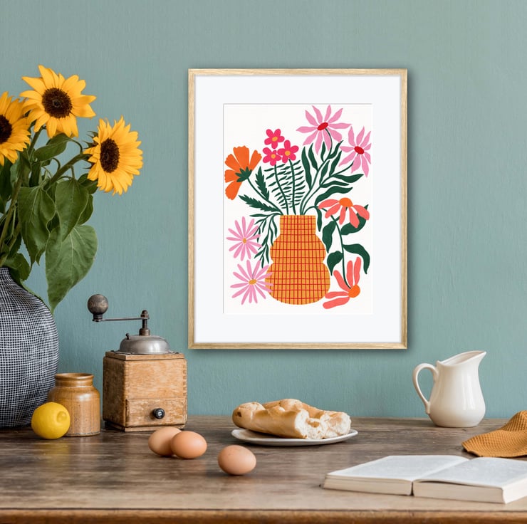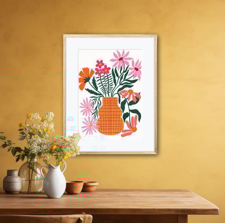 Elevate your space with our stunning still Life Flower Vase print in bright colours, on thick, high-quality archival matt paper. A great print to brighten up any corner of the room.