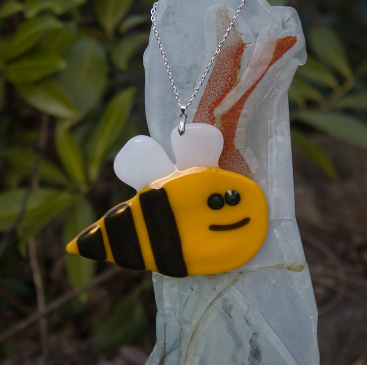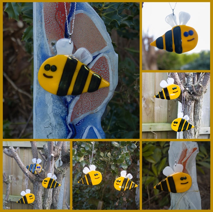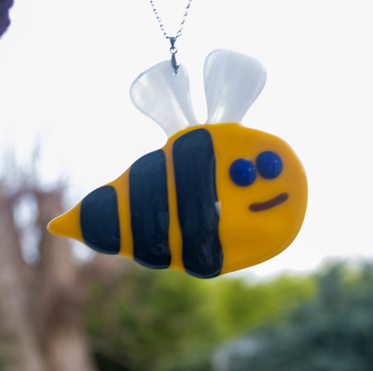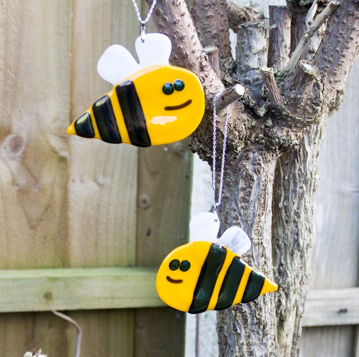 This variety has an 11cm long body made from hand-cut glass. Dark-coloured stripes are added to give the distinctive pattern, together with wings, a mouth and eyes. All the glass is fused together in the kiln after which a length of stainless steel chain is added to hang it from.