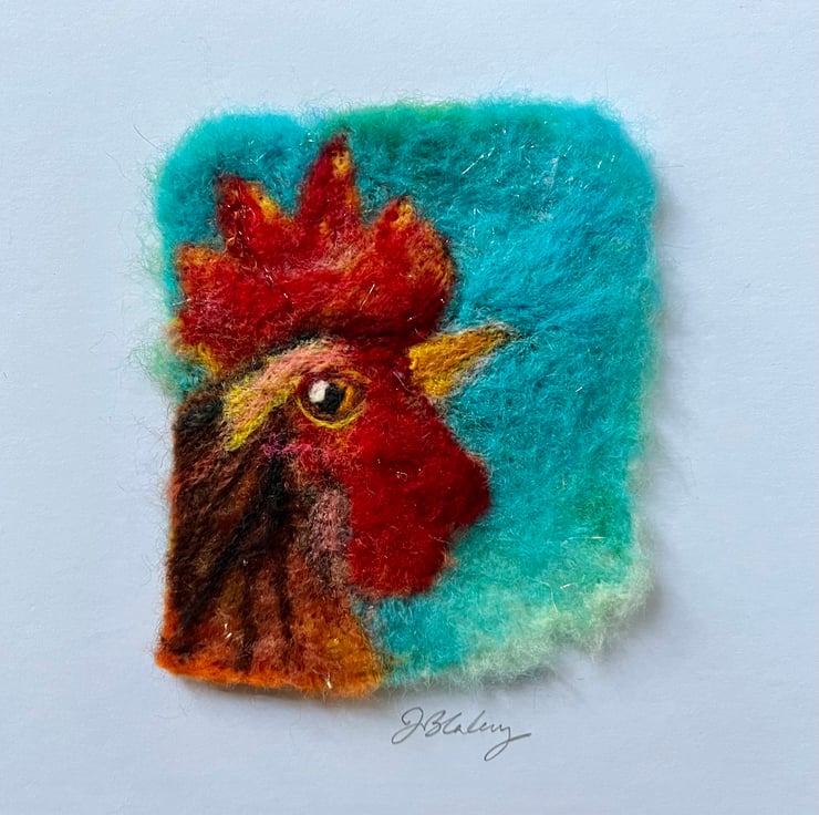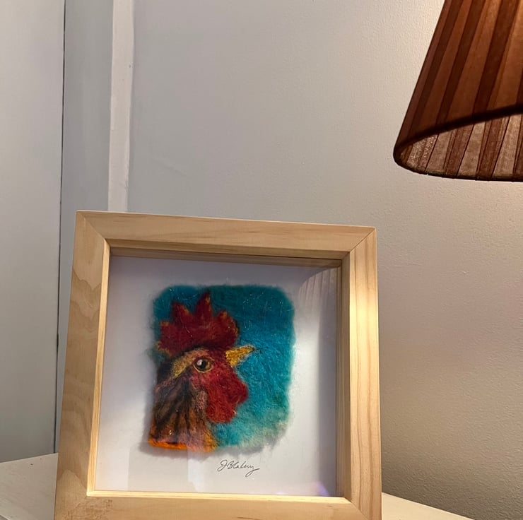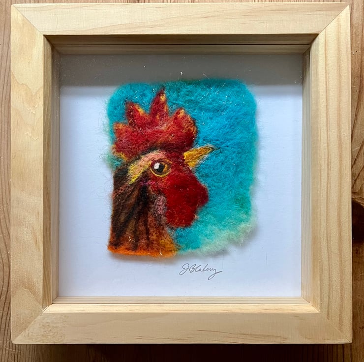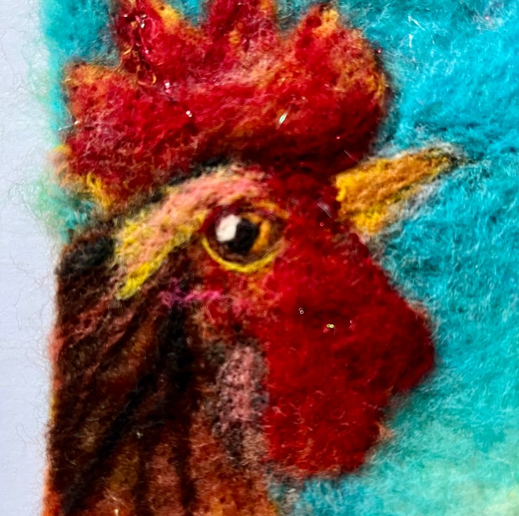 This portrait of a cockerel is wet and needle felted in merino wool with added sparkle.