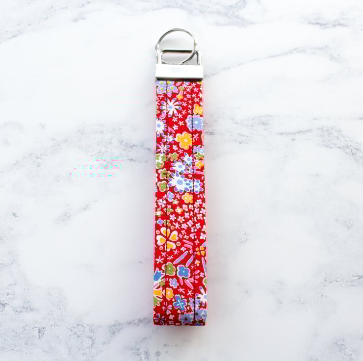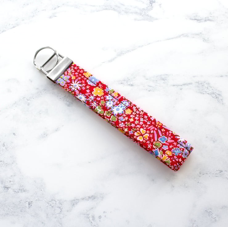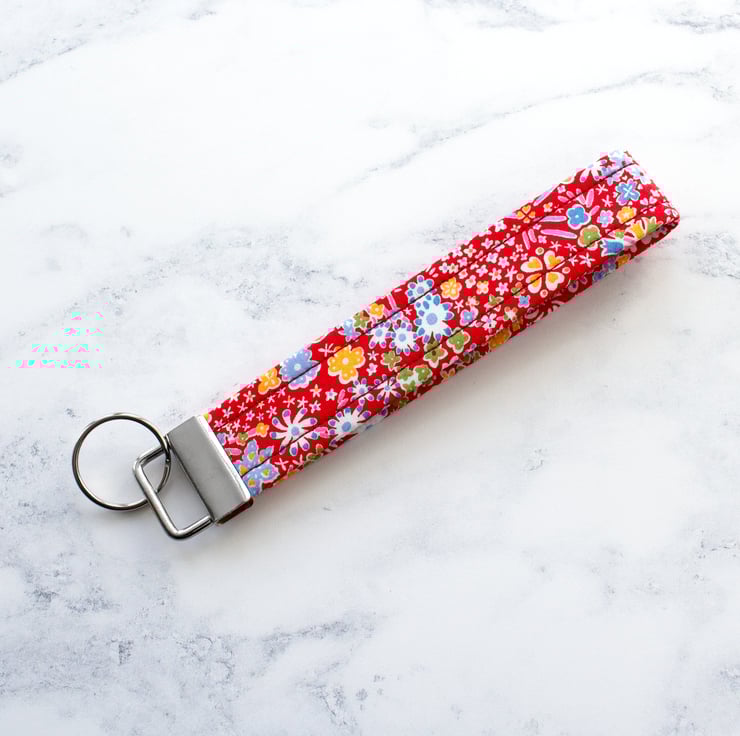Handmade using beautiful cotton fabric, the key fob has a core of webbing to ensure it is practical. Pattern placement will vary due to the items handmade nature.