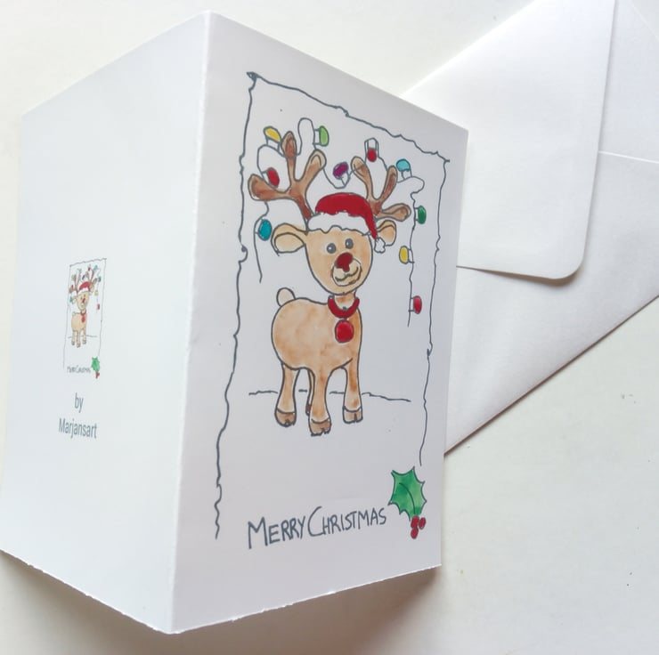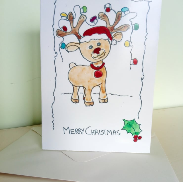 A very cute reindeer with Christmas lights in its antlers. Print of my own Original Watercolour painting on quality white card