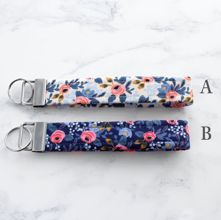 Handmade using beautiful cotton fabric, the key fob has a core of webbing to ensure it is practical. Pattern placement will vary due to the items handmade nature.