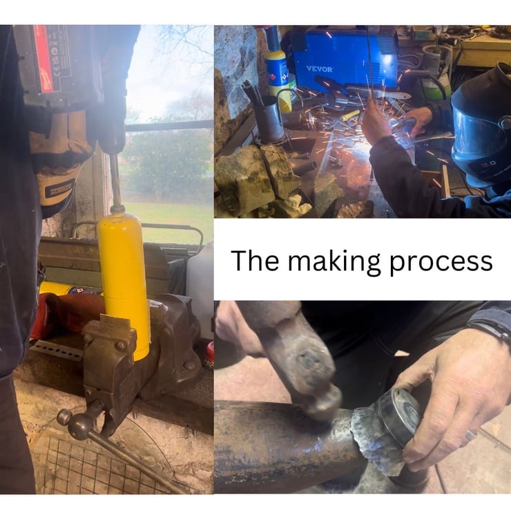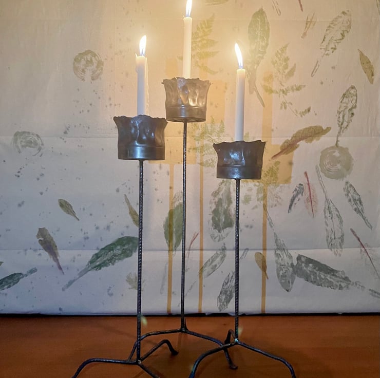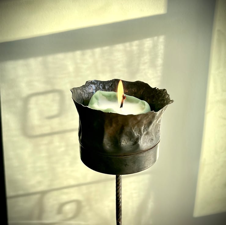 Hand forged and hammered candlesticks made in our forge in the heart of Northumberland. Creatively made using only recycled materials. The base is made from rebar steel forming a tripod and the upper cup is made from part of a gas canister, which has gone through a process to remove all gas, burned then brushed down and hammered to create the detail. Inside the cup is a small spike to secure the candle. All parts have been oiled with boiled linseed oil for longevity.