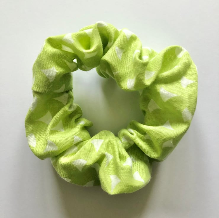 Pretty green hair scrunchie with a white pattern. Made from upcycled fabric!