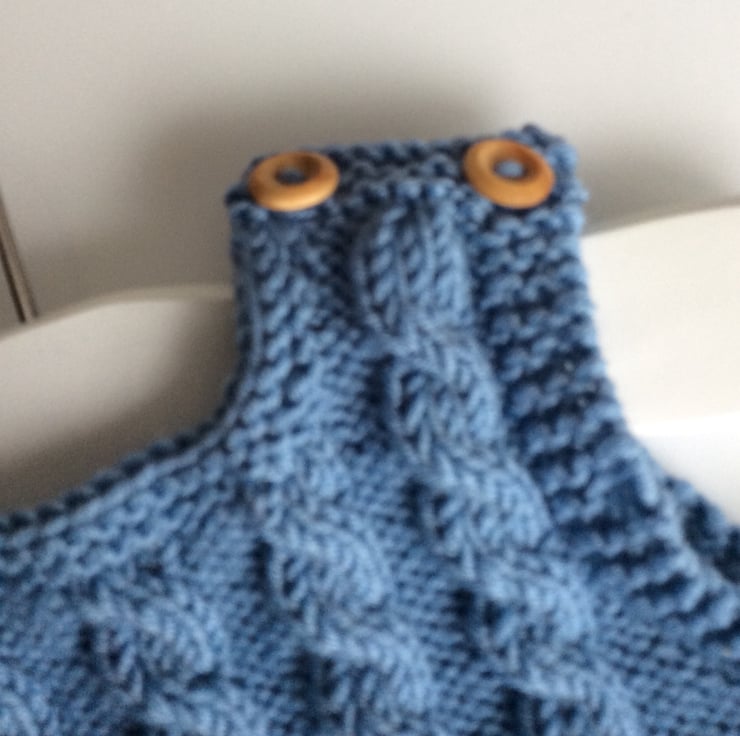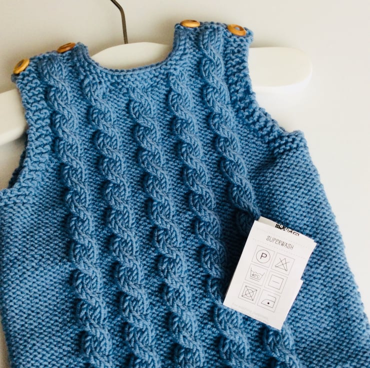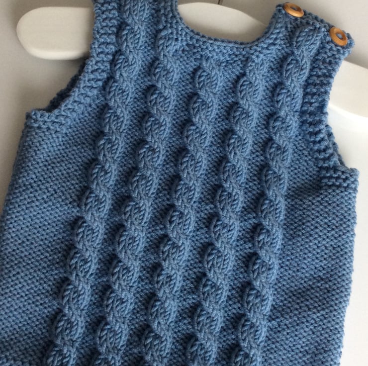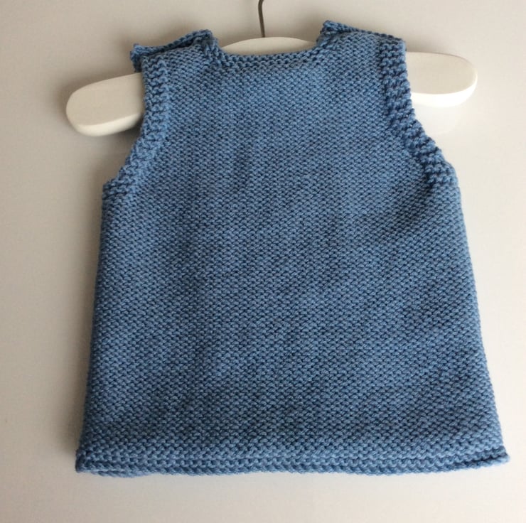 Beautiful baby sleeveless pullover hand knitted by me in my Suffolk home. I have used a gorgeous soft 100% merino wool in a lovey denim blue colour to knit this Drops Design pattern. Merino wool is very kind and gentle to a baby’s skin and will not cause any irritation. Both shoulders fasten with two wooden buttons to enable easy dressing of your little one. Would make a perfect gift for a new arrival. Made to fit up to 6 months approximately.