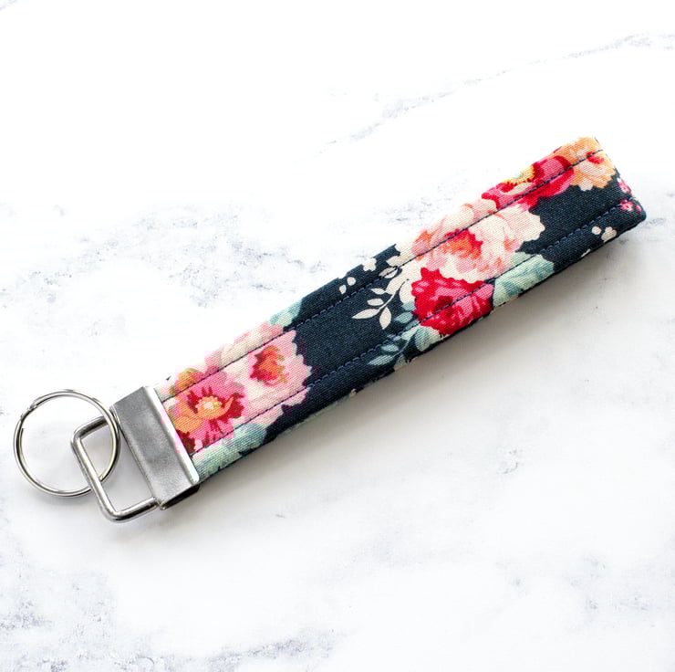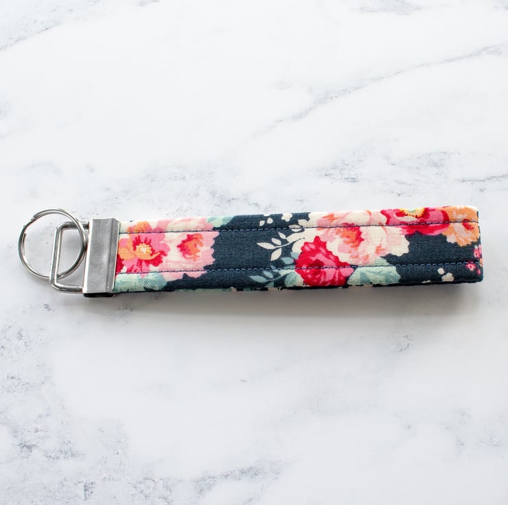 Handmade using beautiful cotton fabric, the key fob has a core of webbing to ensure it is practical. Pattern placement will vary due to the items handmade nature.