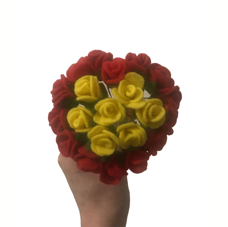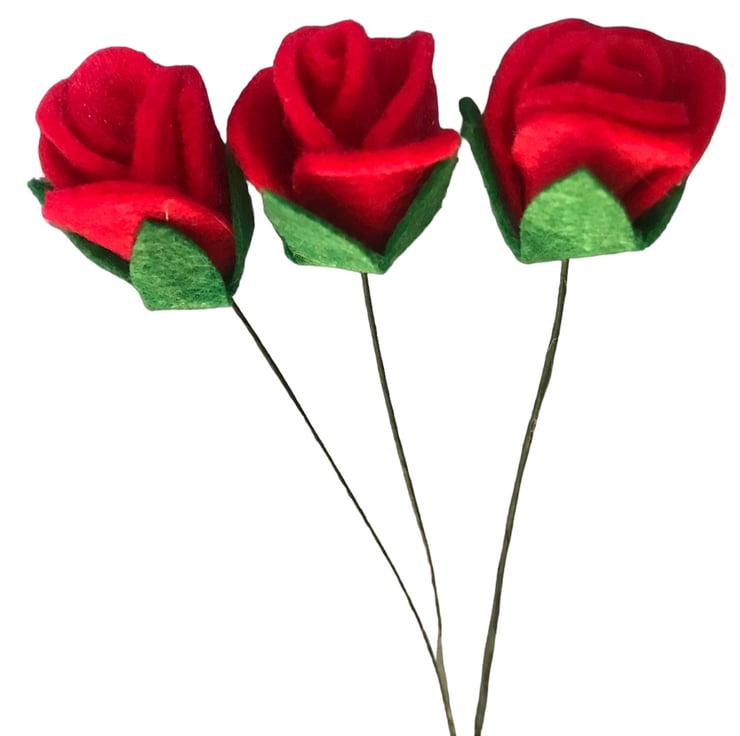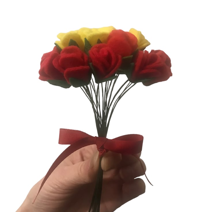 A bunch of mini felt roses finished with a little red bow. Each rose was individually handmade and shaped to achieve the most realistic look as possible. A lovely gift idea for Valentine's Day or a wedding.