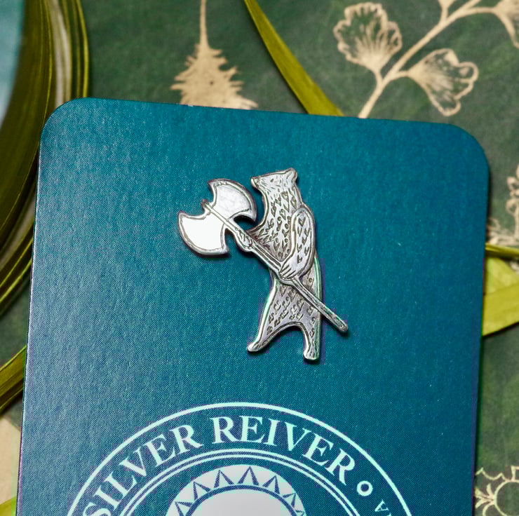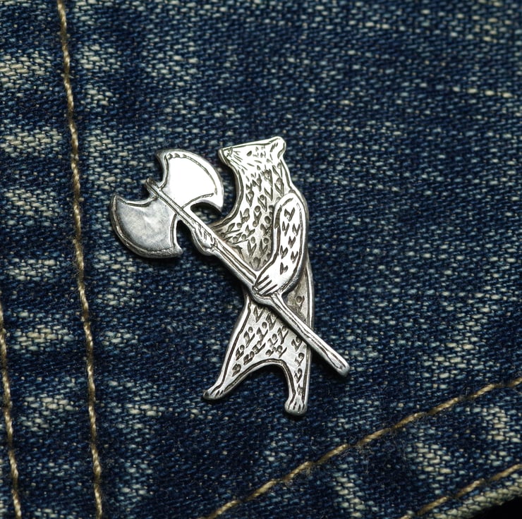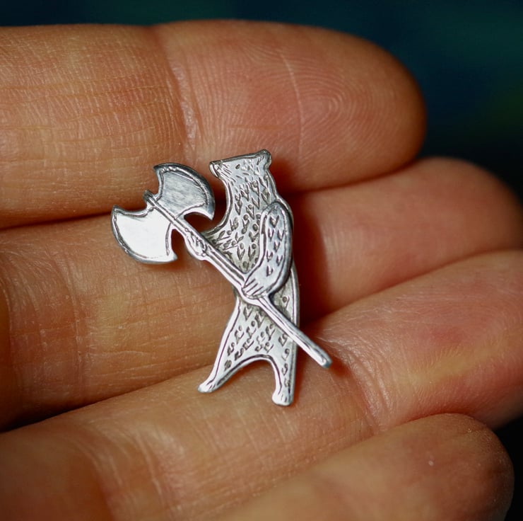 This well-armed little bear pin was inspired by medieval marginalia illustrations. It has been hand cut from 100% recycled .925 Sterling silver sheet, soldered together using traditional silversmithing techniques, filed, polished, and carefully engraved. It has a metal pin on the back, and a butterfly clasp to close.