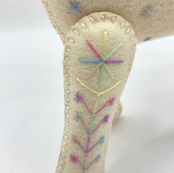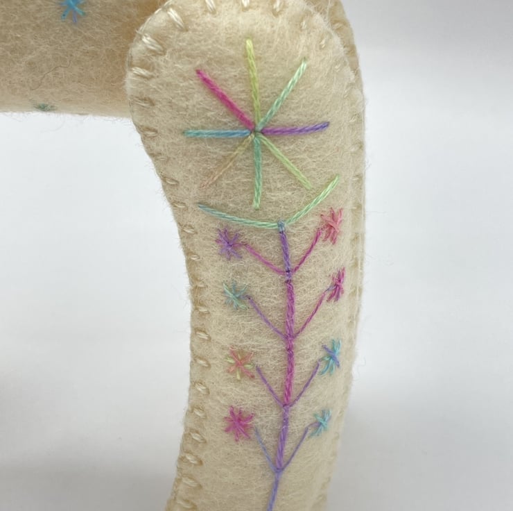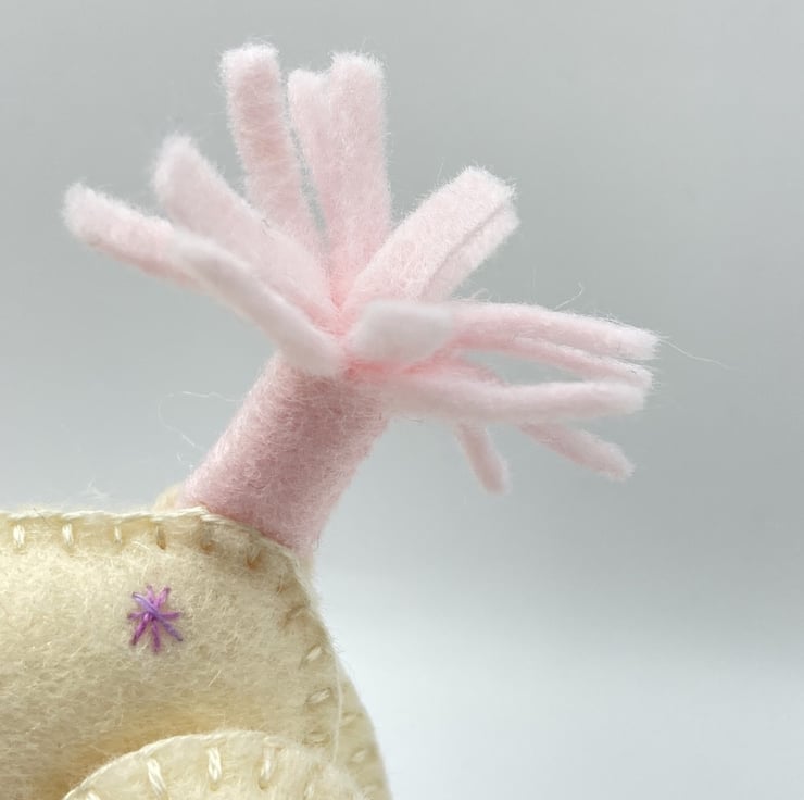 Their body is made from cream and baby pink wool felt and is lovingly filled with Hi-Loft polyester stuffing.