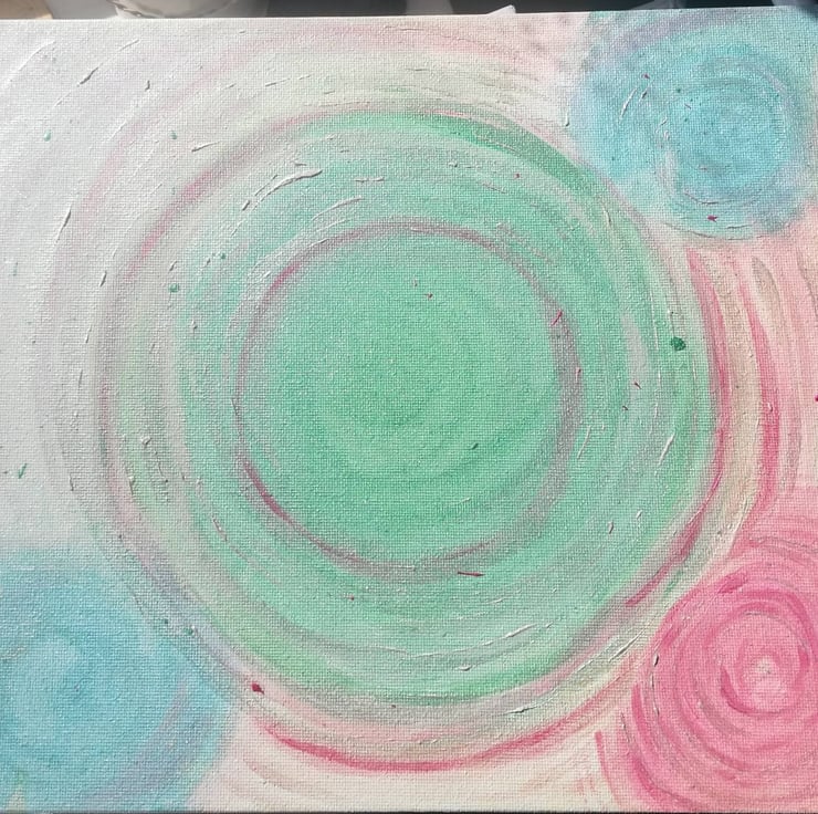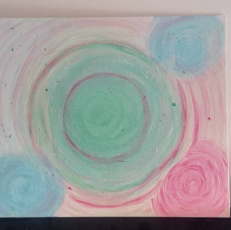Acrylic painting on thin canvas with shimmer and metallic effects. Hand painted. A4 size ish (a bit bigger). Can be landscape or portrait, I personally prefer landscape as I like the big green orb in the middle. Only this one available, there are no prints.