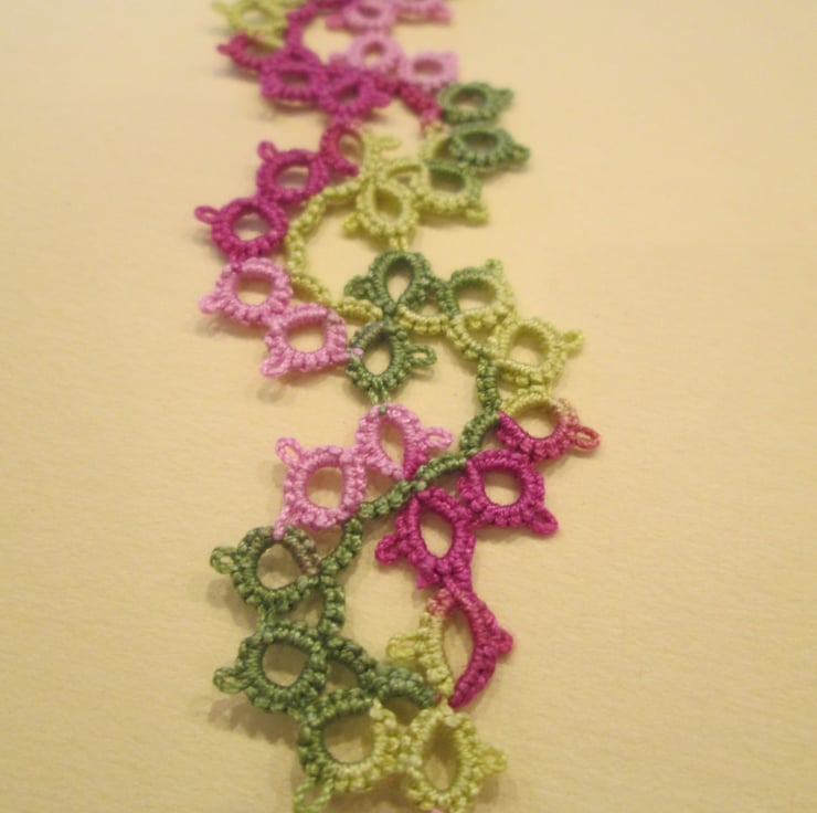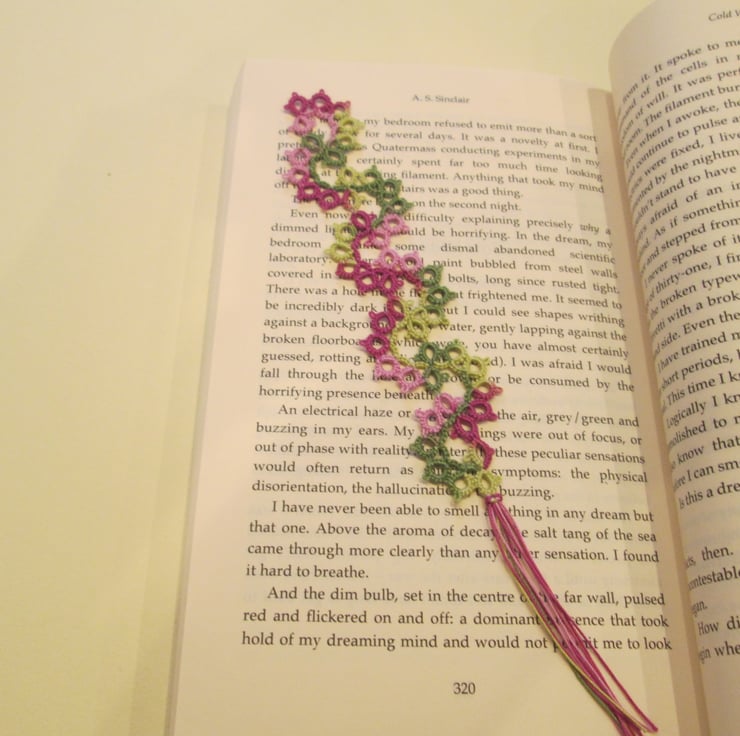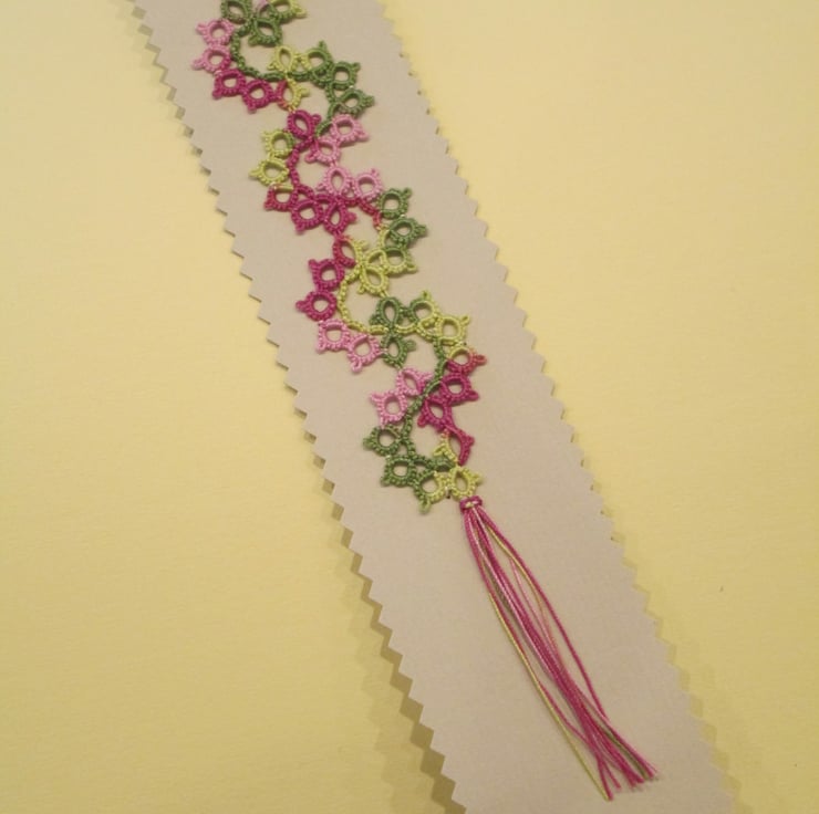 Tatting is an intricate form of knotted lace made with a small shuttle. Here a rippling design has been created with intricate loops and rings making this a pleasing item to keep place in your favourite read. Perfect as a gift or treat for yourself. The cotton used is variegated meaning that no two items created will be exactly the same. This pattern has been designed by me. The bookmark is finished off with multi stranded loose cotton tail. Approximate measurements are eight inches long (20 cm) including tail by one inch (2.5 cm) wide. Bookmark with come presented on a card backing wrapped in clear cellophane. It can be released from the backing by snipping the cotton on the rear of the card. Created in a smoke and pet free home.
