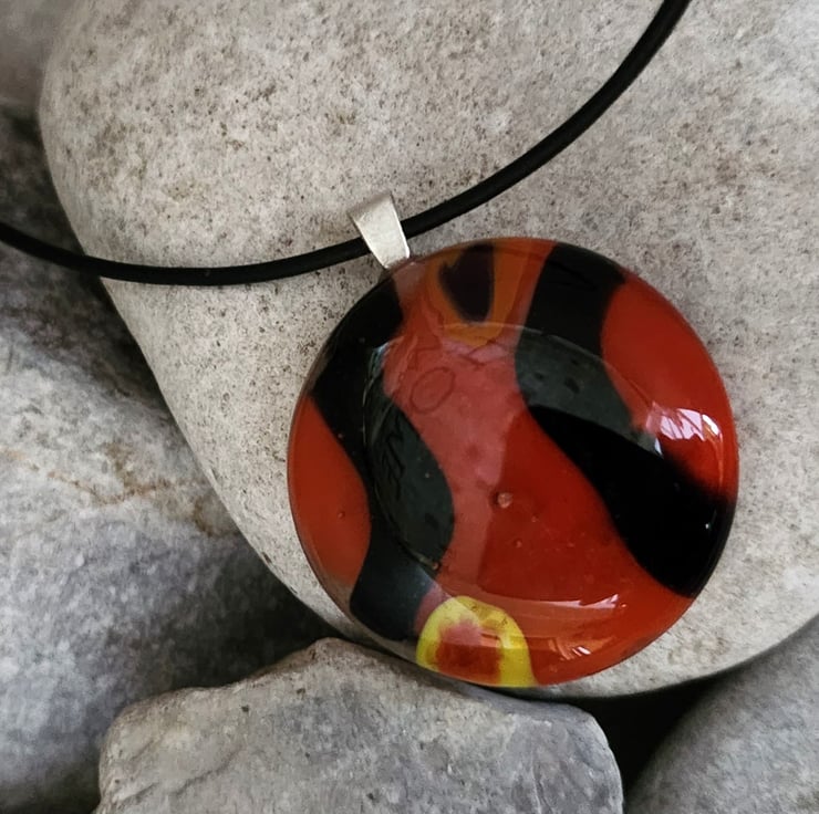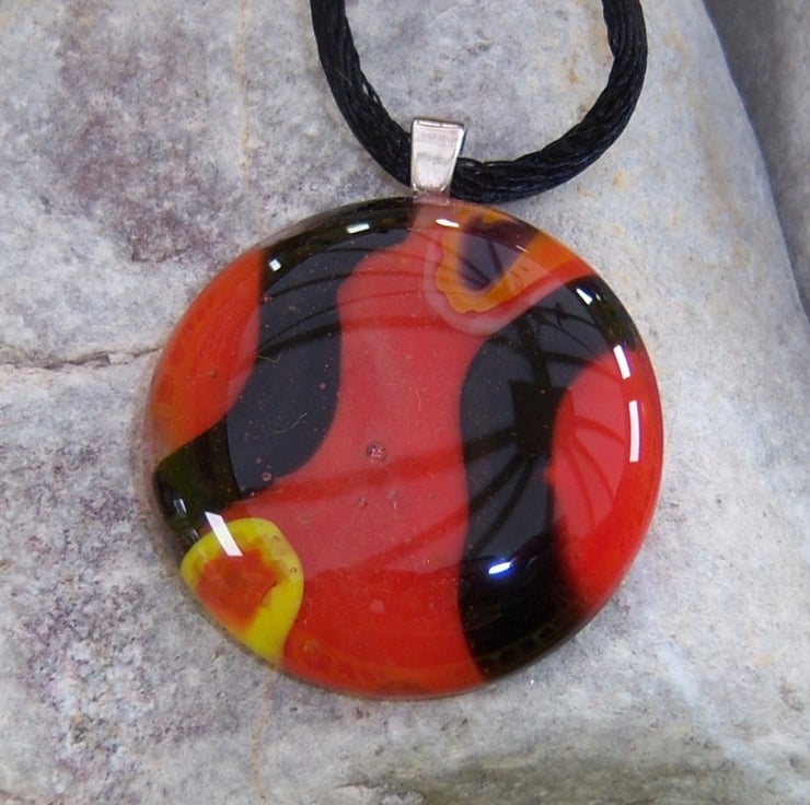 A red glass necklace with two black stripes and two yellow millfiori. Sterling silver bail. Approximately 3cms across.