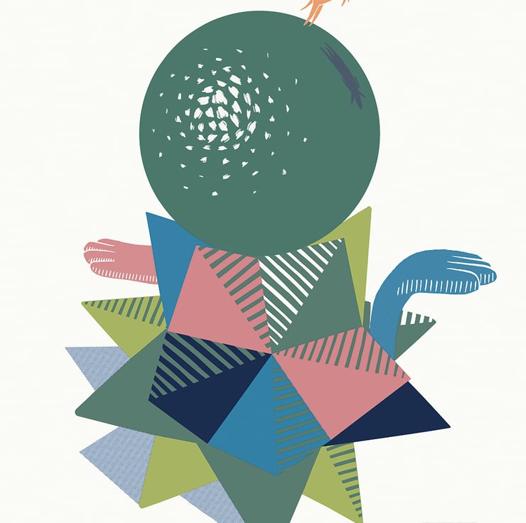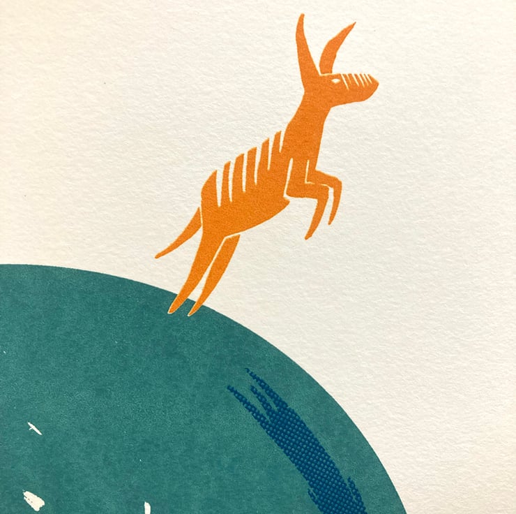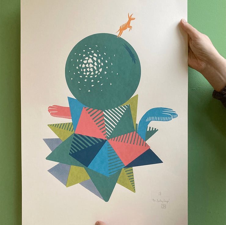 This is a six-colour screen print entitled 'The Donkey Leap' printed in dark green, light green, pink, teal, dark blue and orange.