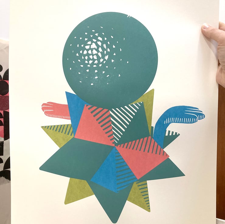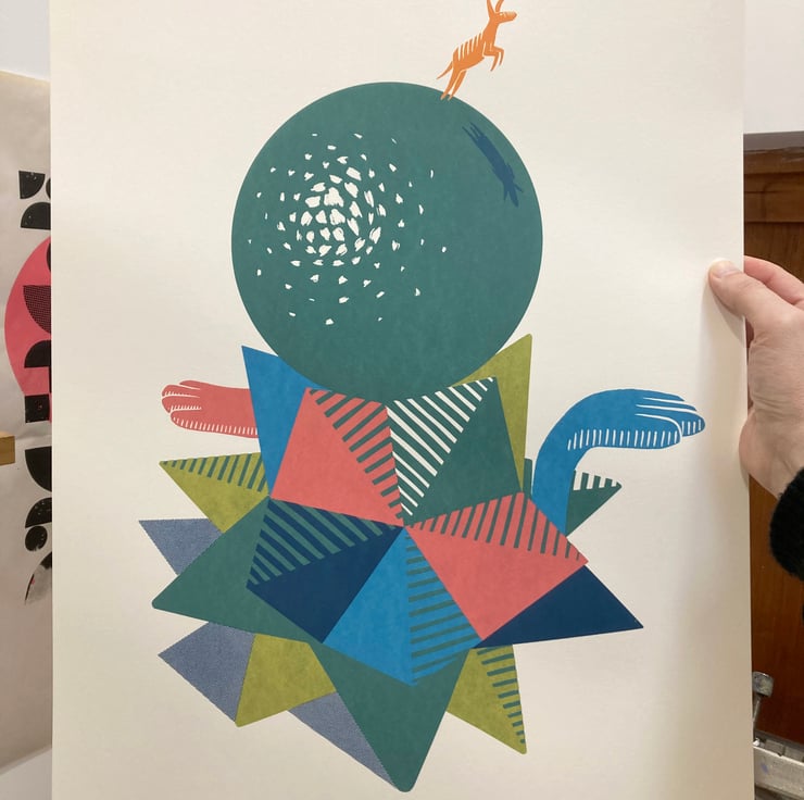 Dark green, light green, pink, teal, dark blue and orange inks on Antique White Seawhite 280gsm acid-free paper. From an edition of only 18, signed, stamped, titled and numbered.