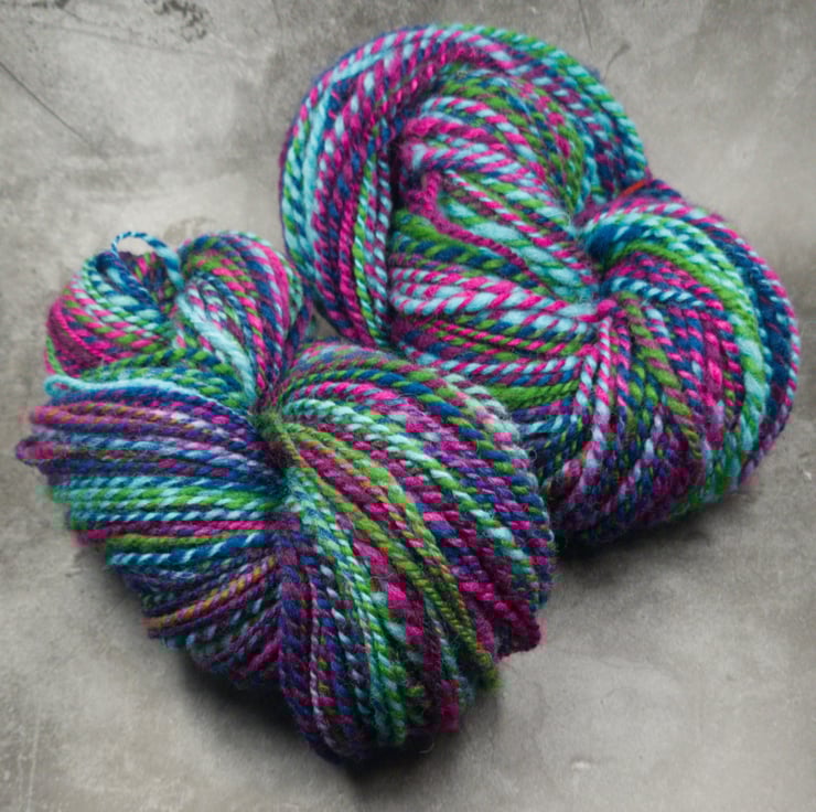 I've spun the 2 ply using the 5 different colours in sequence. When I ply the two singles together the colours combine to give a striking barber pole or mark effect. It's not exactly a 'self striping' yarn but it will move through the colours as you use it.