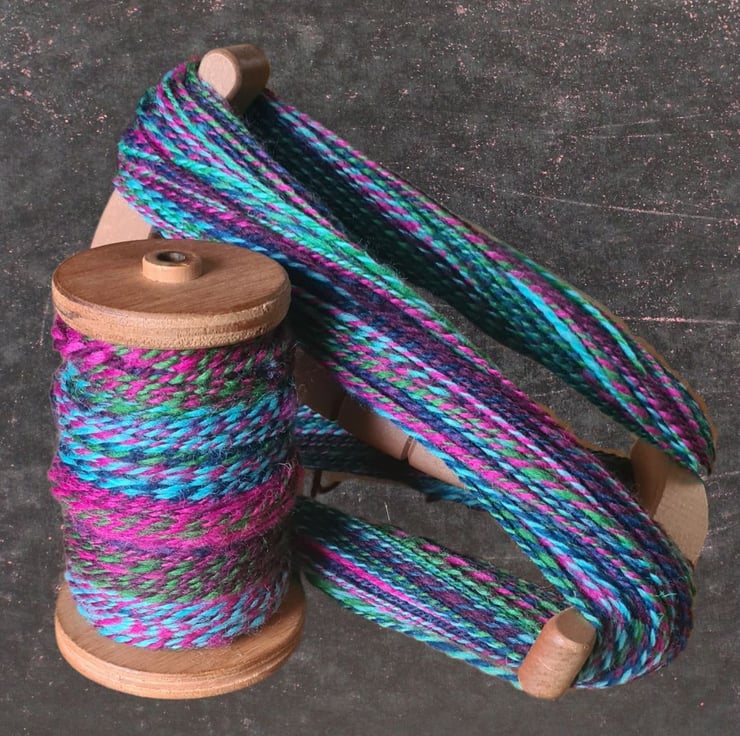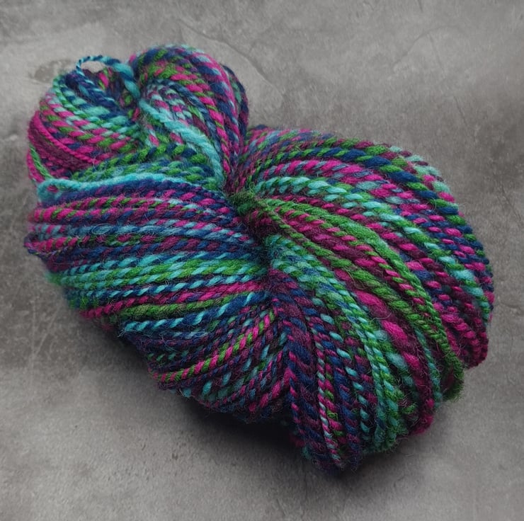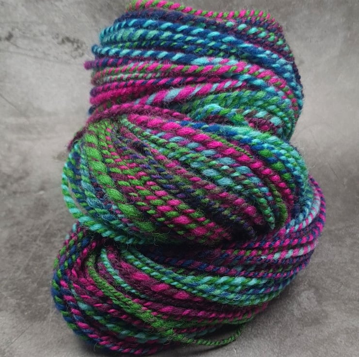 This yarn is spun from welsh mountain/blue faced Leicester cross sheep, from the Cambrian Wool Community Interest Company. These sheep produce wool with beautiful sheen, and incredible bounce, and a long staple length.The fibre was hand dyed (not by me) in Wales too.