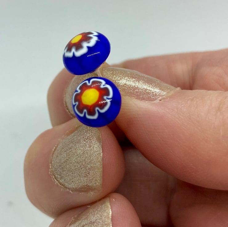 Handmade from slices of colourful millefiori glass which were then fused in my kiln to create these little domed shapes.