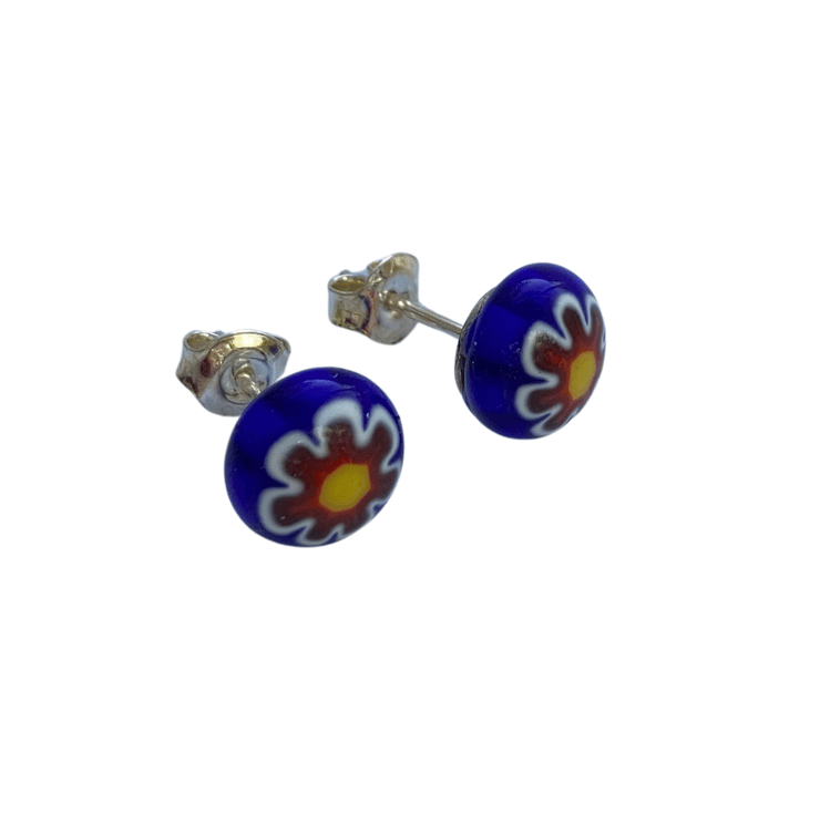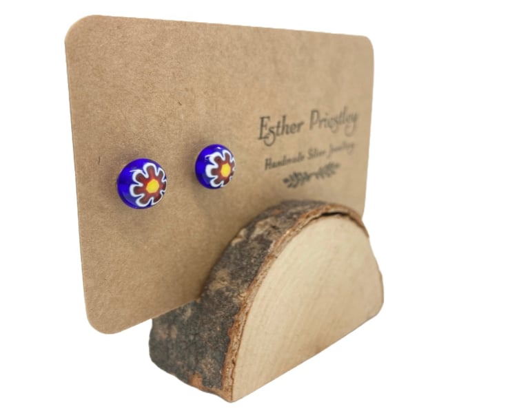 Pretty handmade stud earrings featuring a red and yellow flower on a bright blue fused glass base, mounted onto sterling silver earring posts with 925 silver butterfly backs. a perfect birthday present or gift idea for gardeners or those interested in nature.