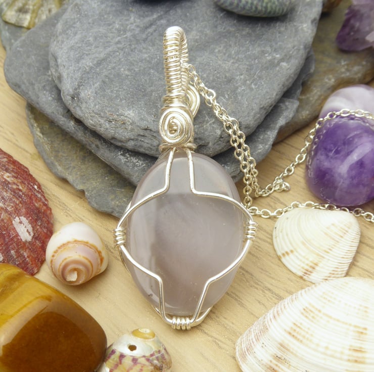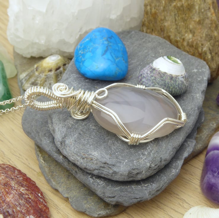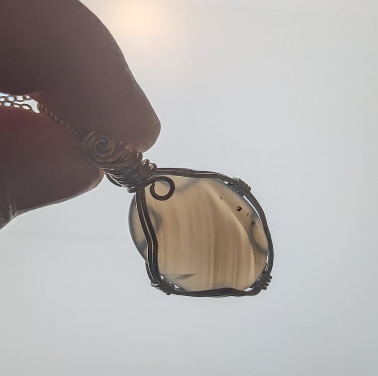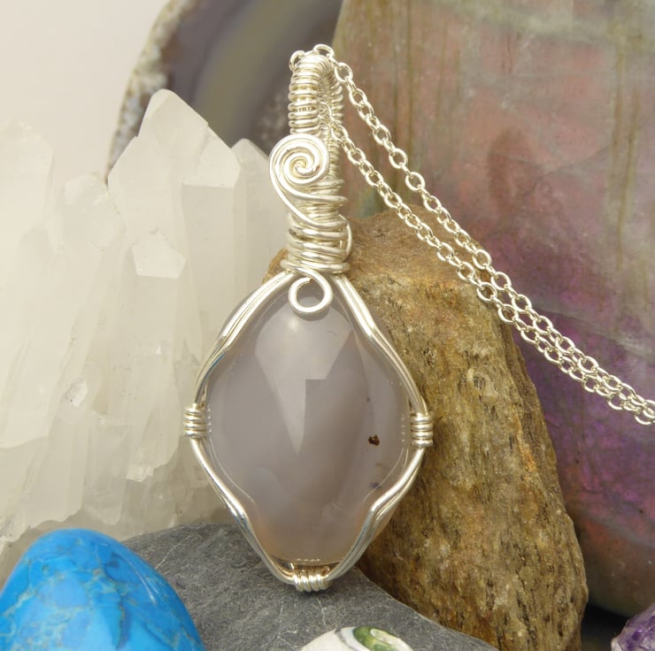 This dainty pendant is made with silver plated copper wire and an oval shaped grey agate cabochon (flat backed stone with no holes drilled in it).
