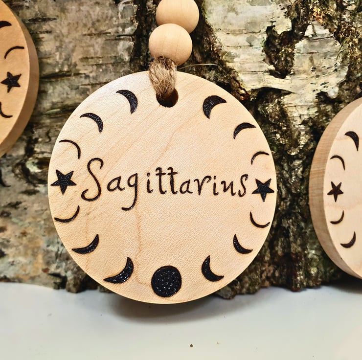 It is round shaped, with a diameter of approximately 6cm (2") and 6mm (1/4 inches thick).It is made from Sycamore wood, light in colour. Both sides are hand drawn with the method of Pyrography (wood burning), one displaying the symbol of the Sagittarius zodiac star sign, while the other shows the word "Sagittarius" surrounded by the moon phases. It connects with the metallic lobster type hook with natural twine, which is decorated with 2 wooden beads. The keyring is approx. 12.5cm long in total.