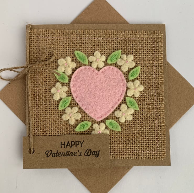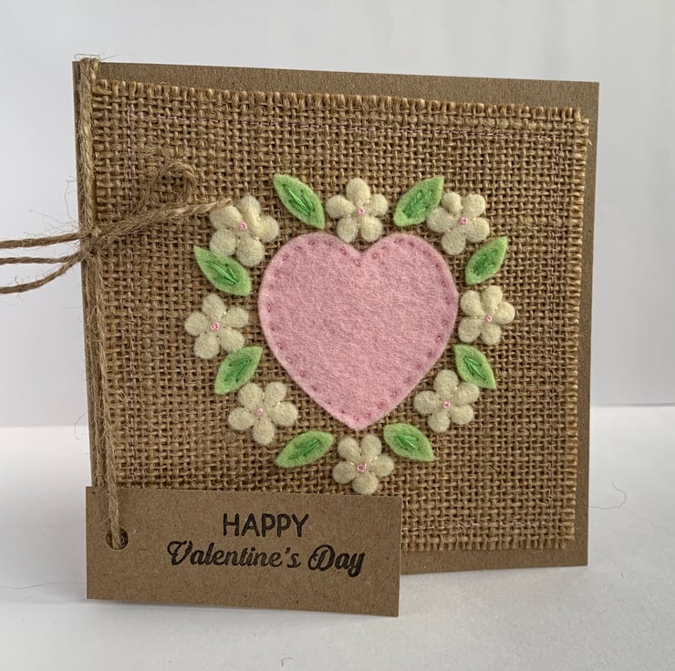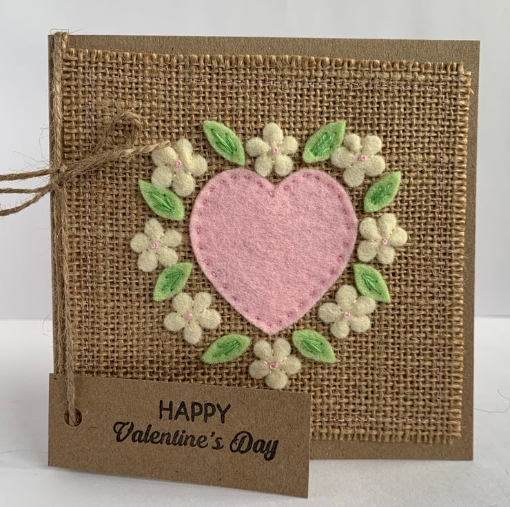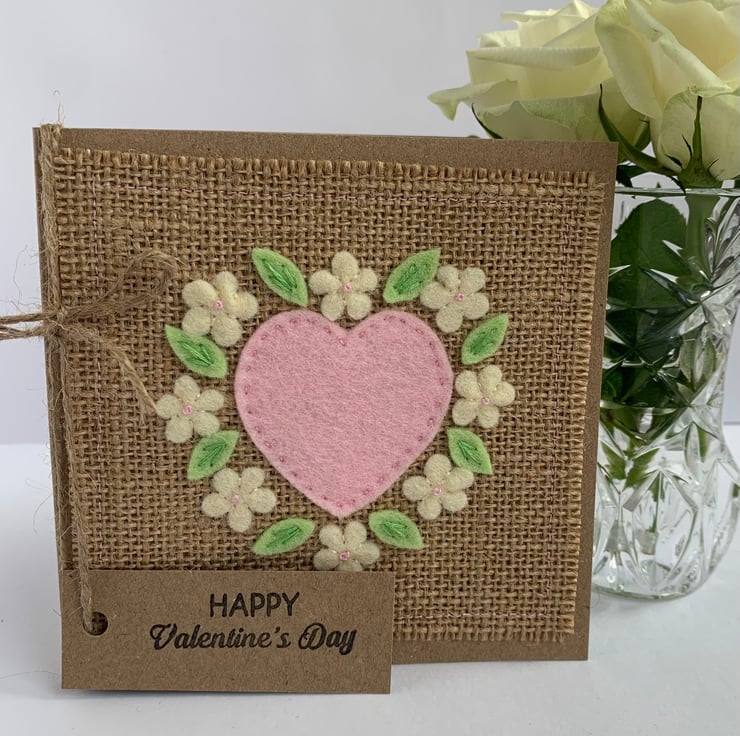 A unique card to send on Valentines Day. This handmade Valentine card is decorated with a pale pink heart and flowers in cream with pale pink centres. The decoration is hand cut from 100% wool felt. It is then sewn by hand onto a hessian background.