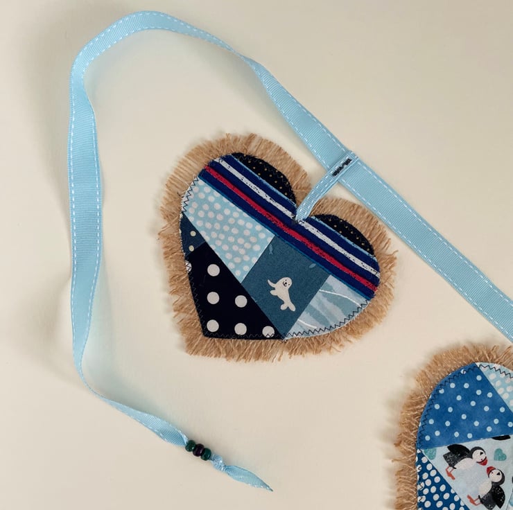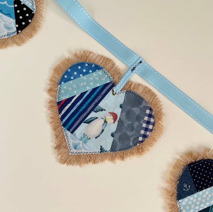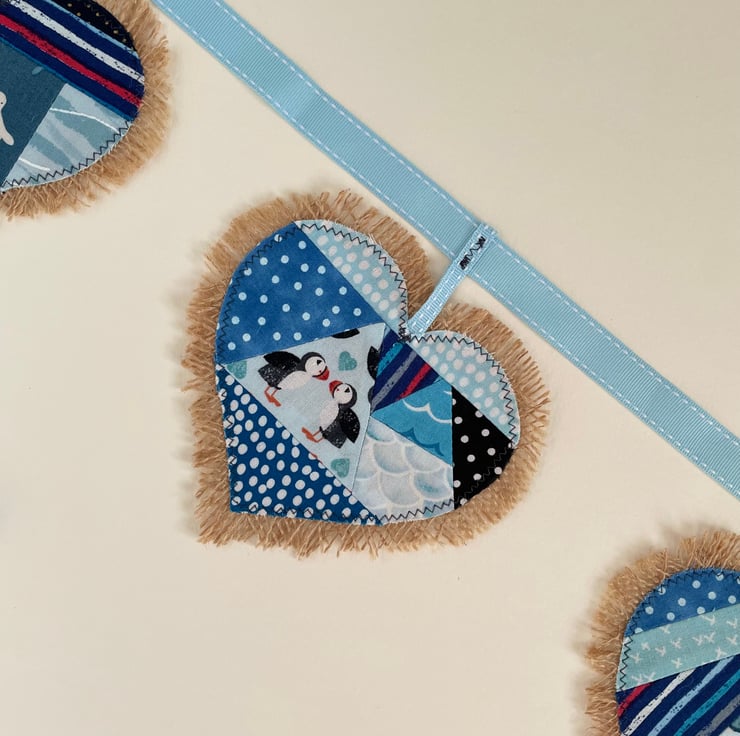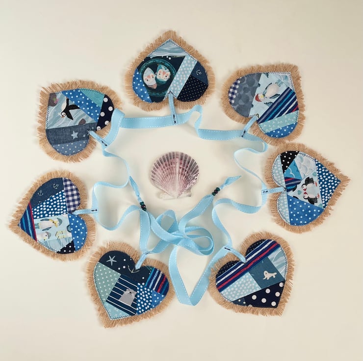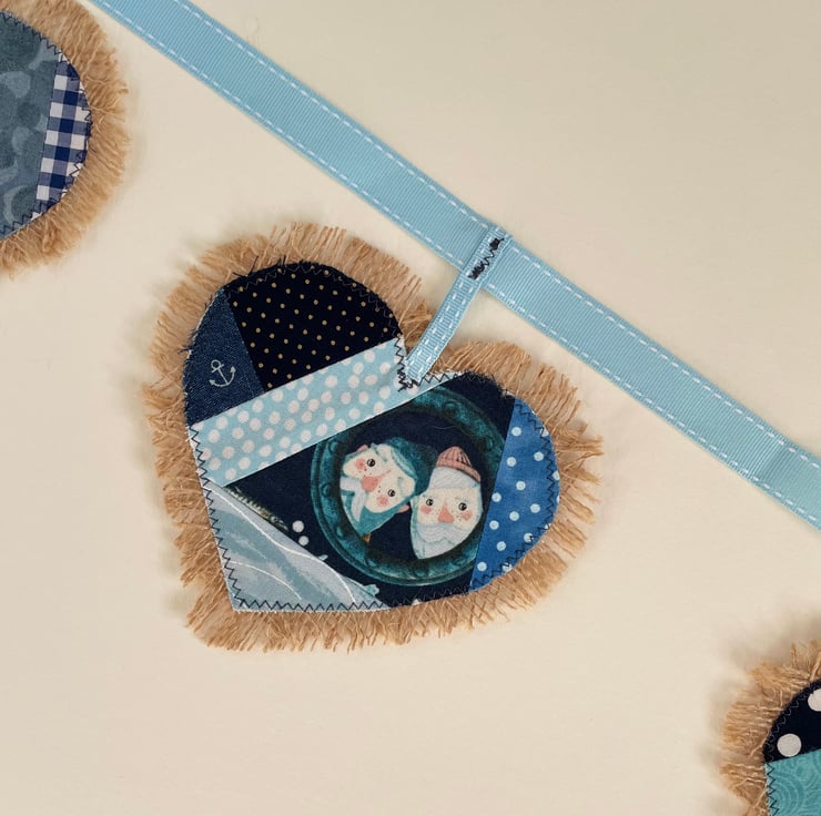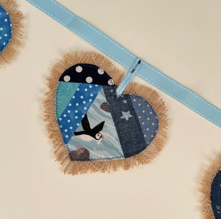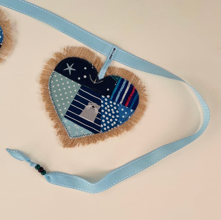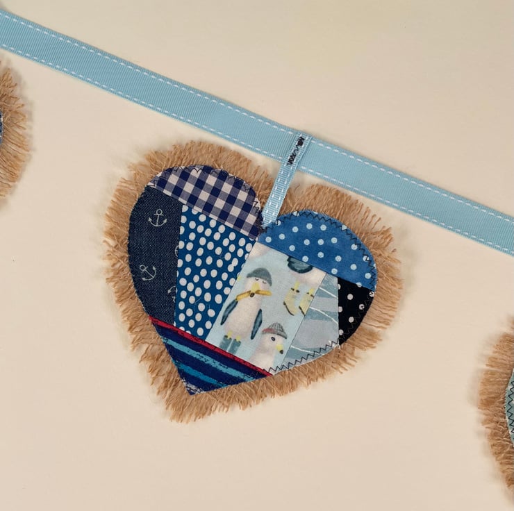 Cute bunting made from 7 hearts on a hessian. Seaside desing with cheeky seagulls and fisherman and much more. Perfect for your beach hut or child bedroom to decorate. Each heart is different. 196 cm from long one end to the other. One sided.