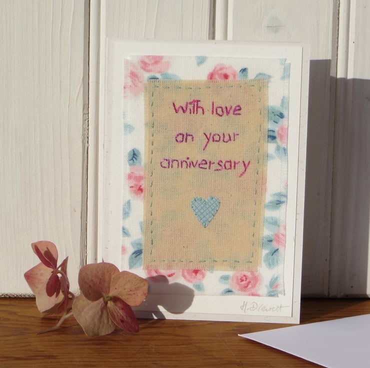 This is a small greeting card featuring a hand-stitched miniature applique heart with hand-stitched the words 'With love on your anniversary'. The central panel is stitched to a pretty cotton fabric of roses. A pretty little card to keep.