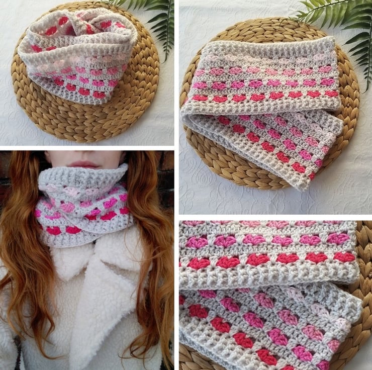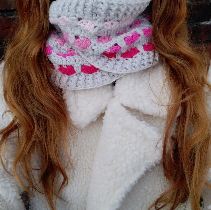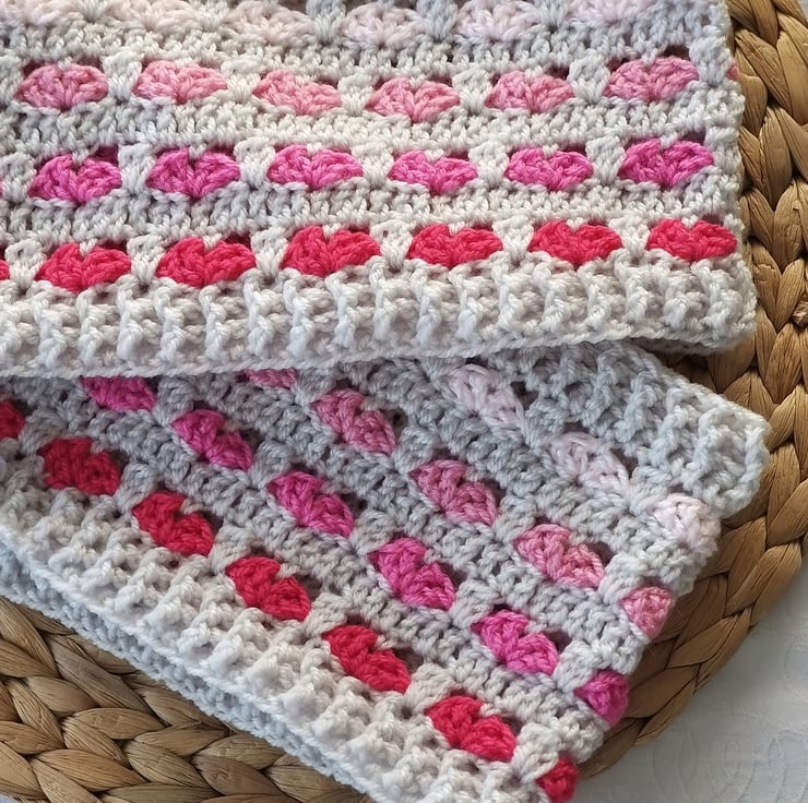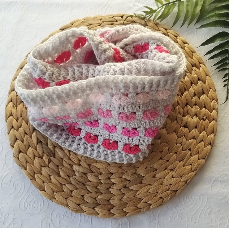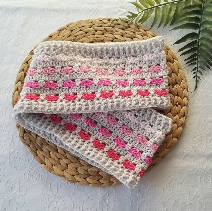 Made with a soft acrylic yarn in a pale silvery grey, I’ve added rows of hearts in different shades of pink and finished off with gentle stretchy ribbing top and bottom.