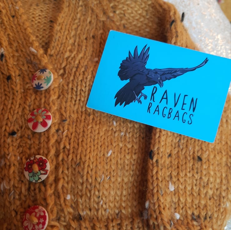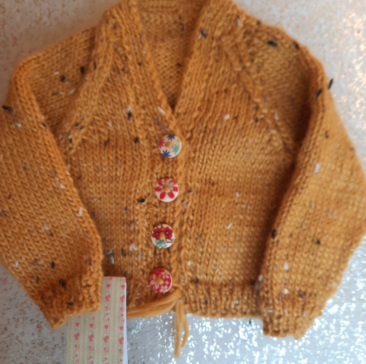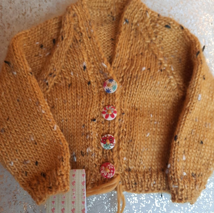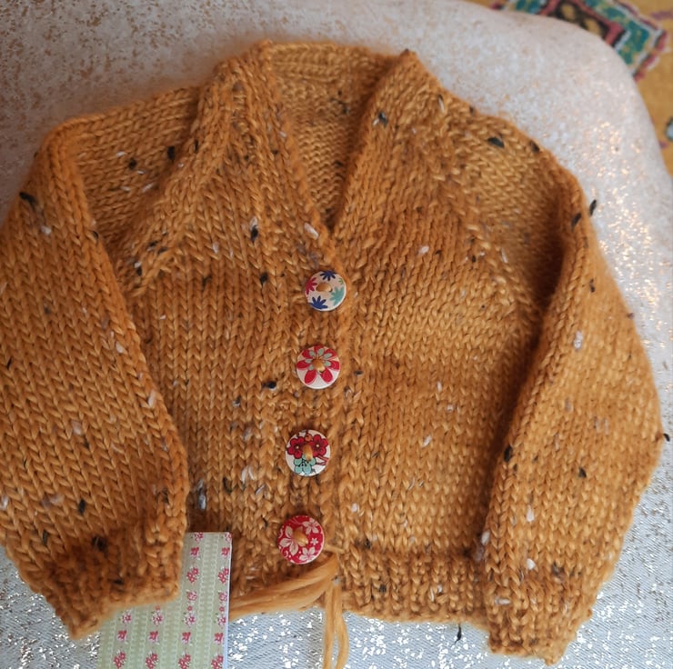 This gorgeous little golden saffron cardigan is hand knitted from 94% recycled polyester yarn and has a lovely soft, warm feel. The yarn has a speckled tweed effect and the cardigan fastens with four cute little floral buttons. Made to fit newborn to approximately 3 months with a chest measurement of 14 to 15 inches. I recommend a gentle hadwash for this item.