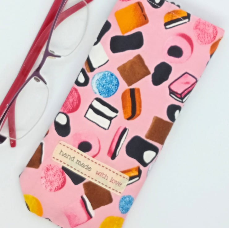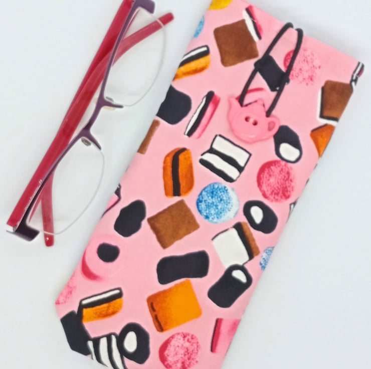 It is wadded to protect your glasses and features a hand made with love label on the back. The lining is in bright pink cotton and it has a cute teapot button and a loop closure to keep your glasses secure.