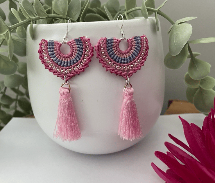 I have created these earrings using the intricate art of macrame. The colours I have chosen for this design are delicate shades of pink and lilac . The fan shape is formed around a central jump ring to which I have attached a hyper allergenic earring wire for pierced ears.