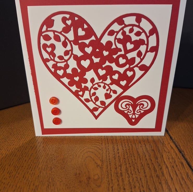 A 6" square (152mm x 152mm) card featuring 2 intricate lace, die cut hearts The card has also been embellished with 3 small buttons.