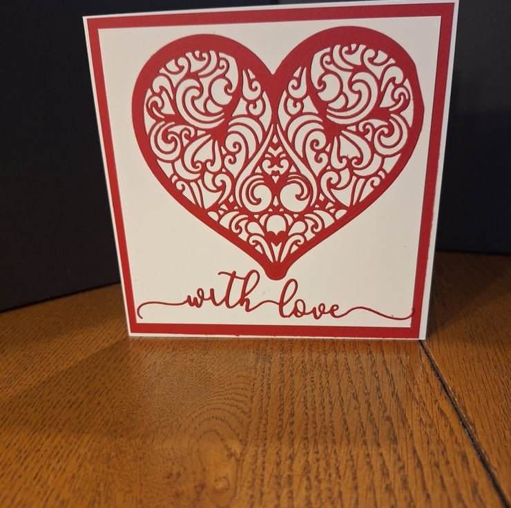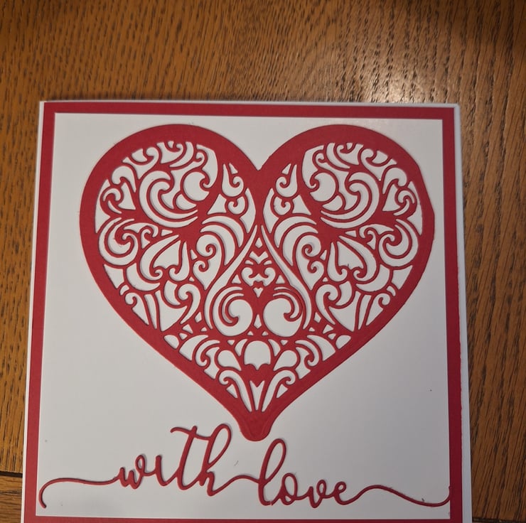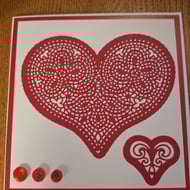 A 6" square (152mm x 152mm) card featuring an intricate lace, die cut heart.