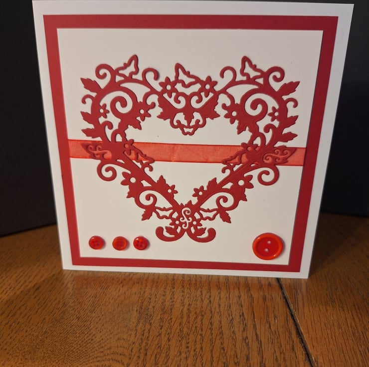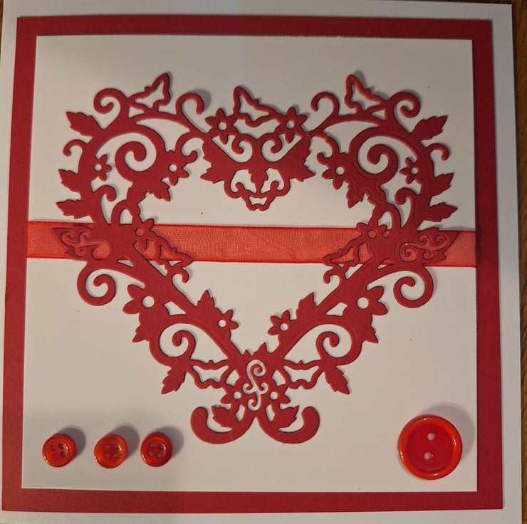 A 6" square (152mm x 152mm) card featuring an intricate lace, die cut heart. The card has been further embellished with ribbon & buttons.