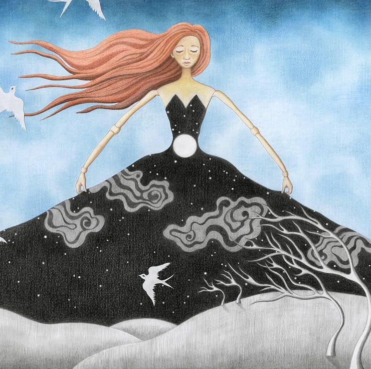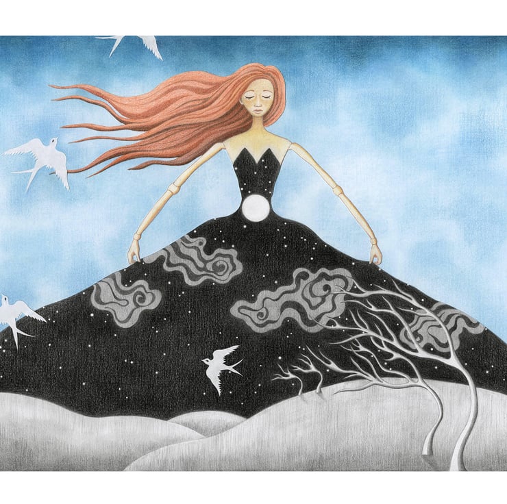 This piece was originally commissioned by a rock band - one of a few illustrations for their website. This one was inspired by a combination of one of their songs and by a Viktor & Rolf (avant-garde fashion designers) exhibition I had recently visited, where their clothing was modelled on life sized dolls. I was also creating a lot of surreal hillscapes with pencil, at that time.