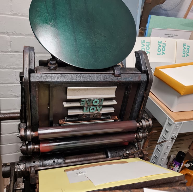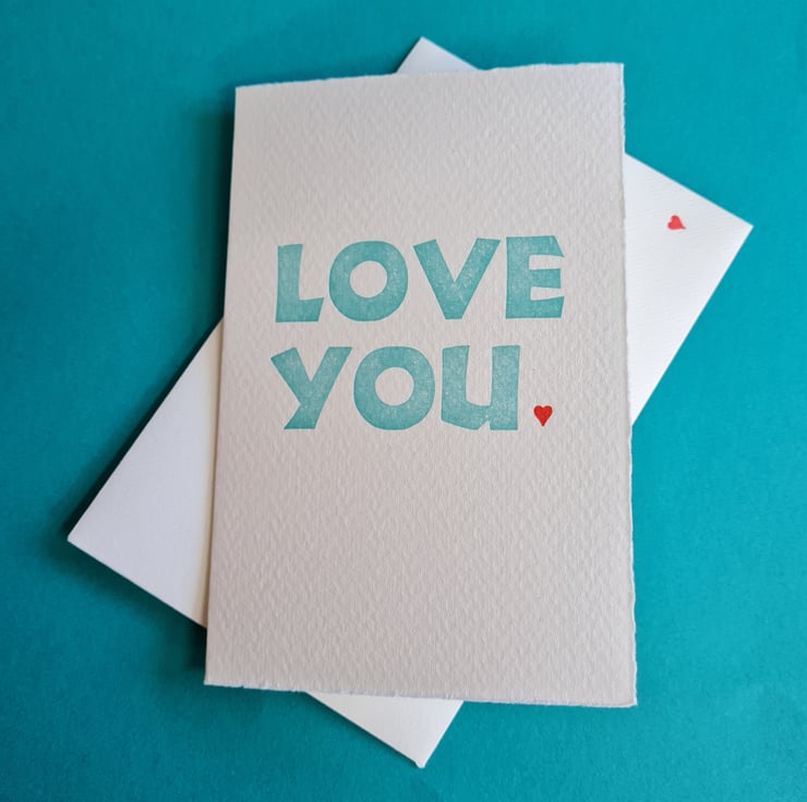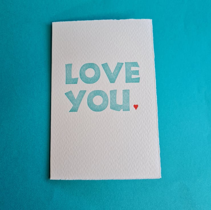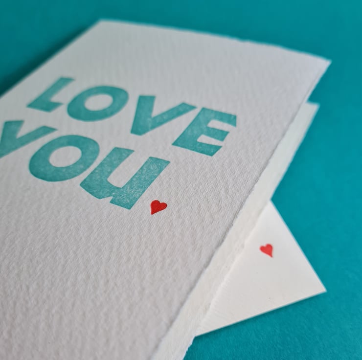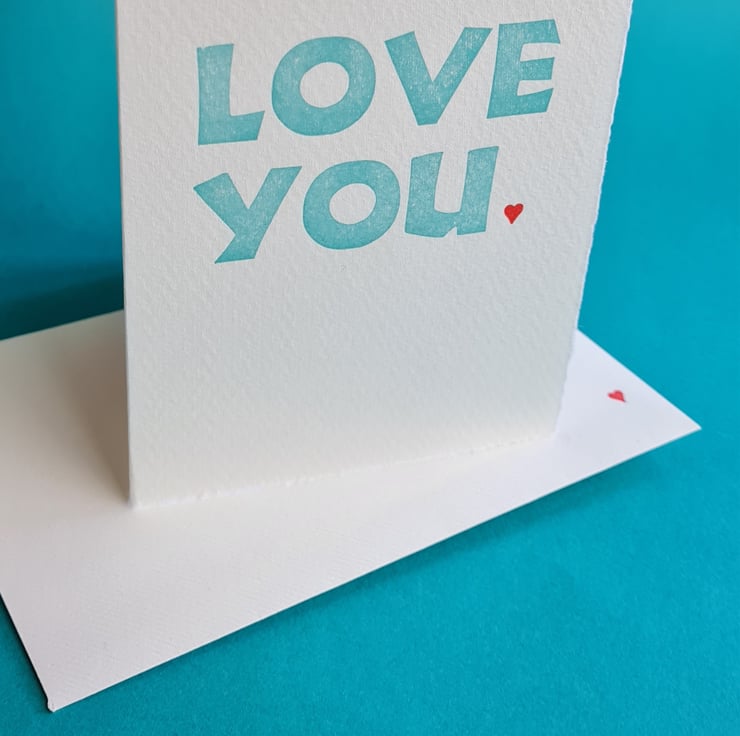 Main text printed in turquoise on my 1880s Cropper Charlton treadle press, Percy, the red heart on my tiny 5 x 3 Adana.
