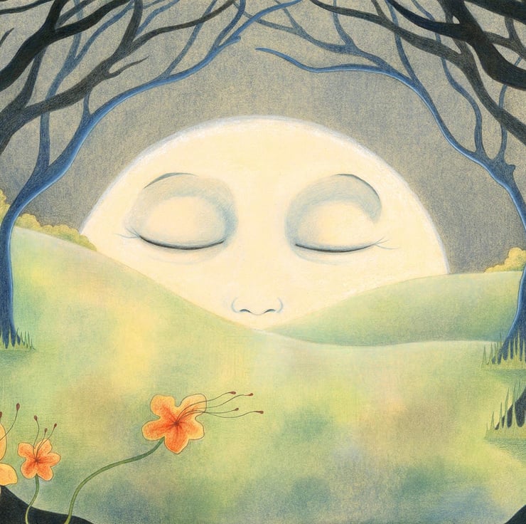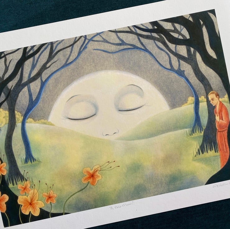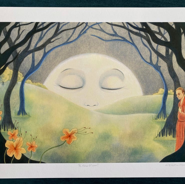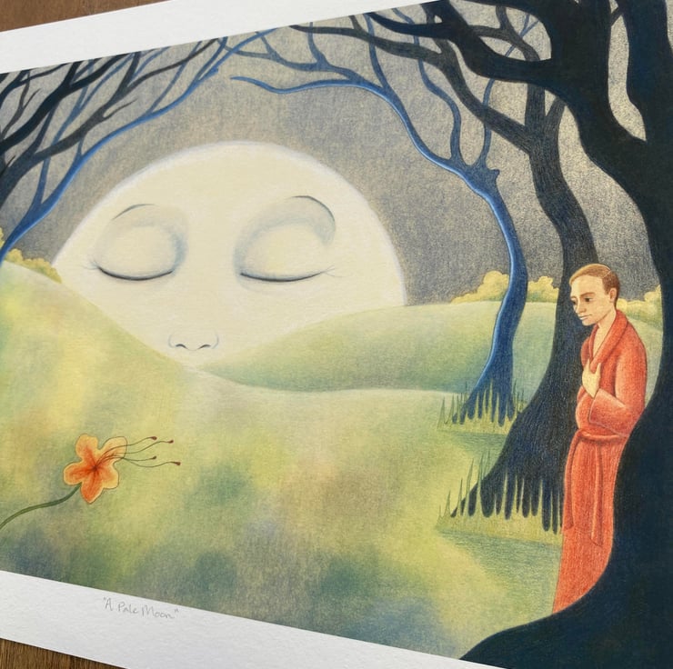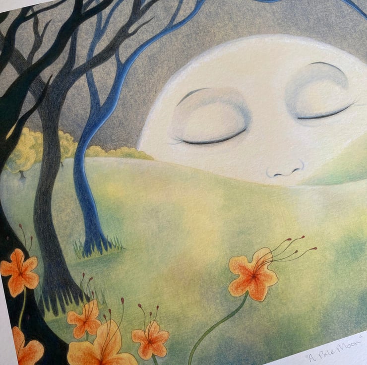 I used coloured pencils, pencil and chalk pastel to create this atmospheric, mysterious, figurative illustration - "A Pale Moon".