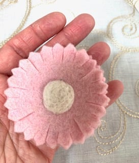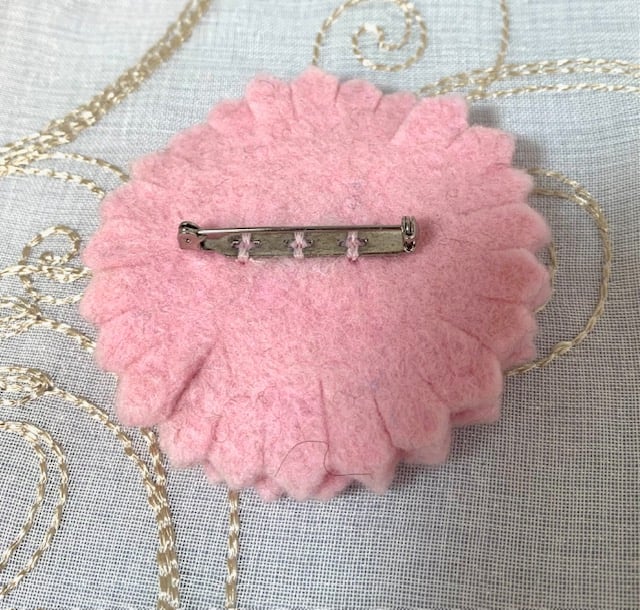 Such a cute piece but I am resting this design for a bit and need to make room for other work. Made from pink merino wool, the brooch has been wet felted with soap and water, dried and then needle felted through the centre. It has a secure brooch back sewn onto it and looks great on a smart coat, denim jacket, bag or hat! Around 7.5cm in diameter.