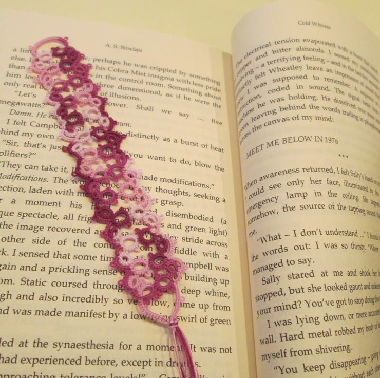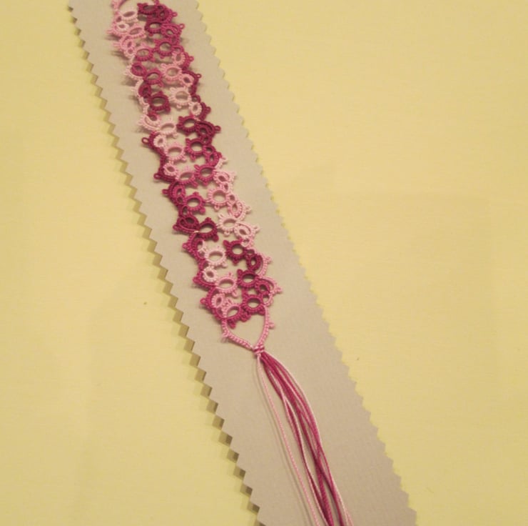 Tatting is an intricate form of knotted lace made with a small shuttle. Here a symmetrical pattern has been created with intricate loops and rings making this a pleasing item to keep your place in your favourite read. Perfect as a gift or treat for yourself. The cotton used is variegated meaning that no two items created will be exactly the same. The bookmark is finished off with a multi stranded loose cotton tail. Approximate measurements are eight inches long (20 cm) including tail by one inch (2.5 cm) wide. Bookmark with come presented on a card backing wrapped in clear cellophane. It can be released from the backing by snipping the cotton on the rear of the card. Created in a smoke and pet free home.