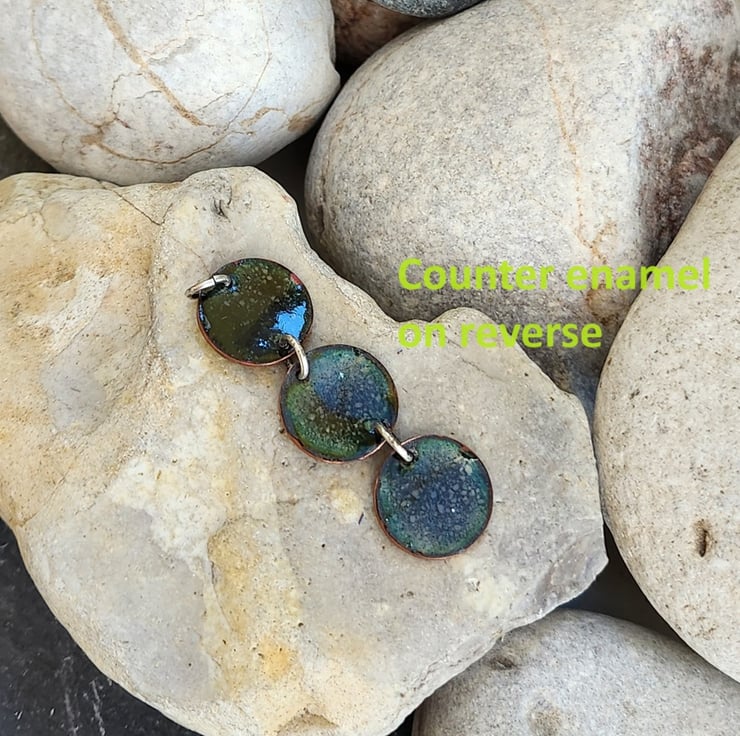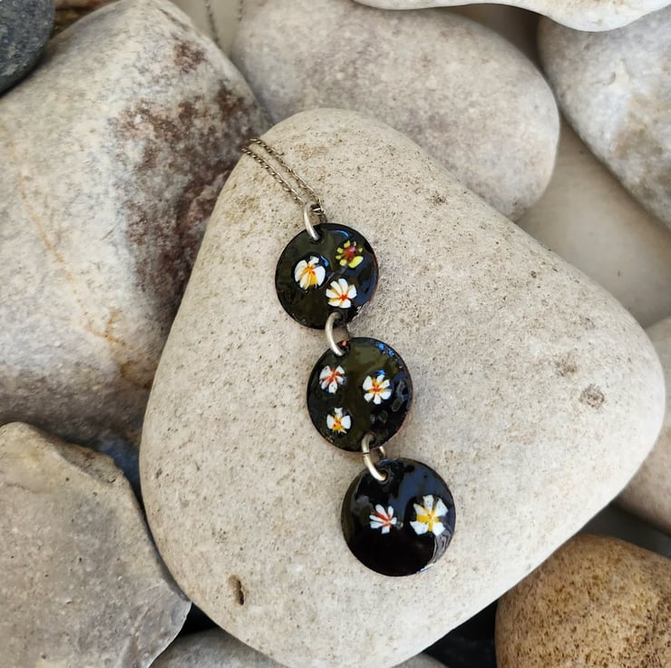 Black enamel kiln fired with random floral wafers, onto three tiny, slightly domedcopper disks. Counter enamel on the reverse. Each 15mm across, totally approximatey 4.5cm drop. Sterling silver links.