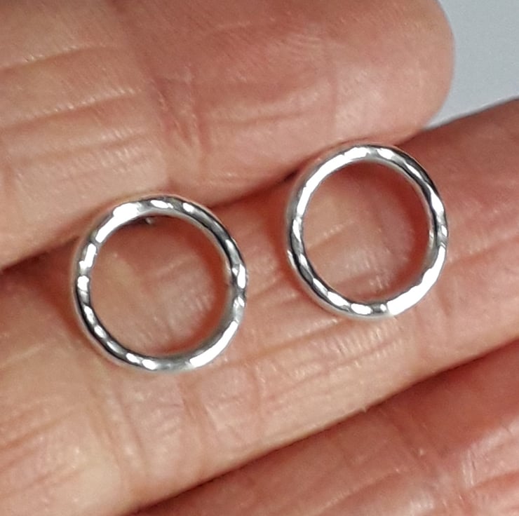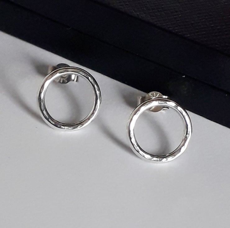 The circle earrings measure 1.2 cm and are finished with a hammered texture which gives a bounce back of light and a high shine polish.