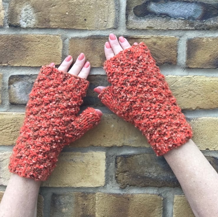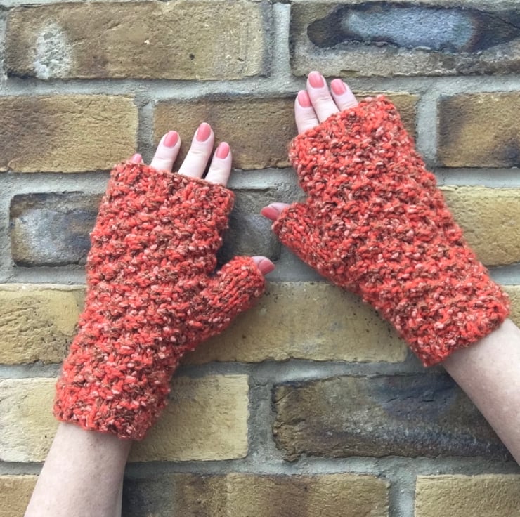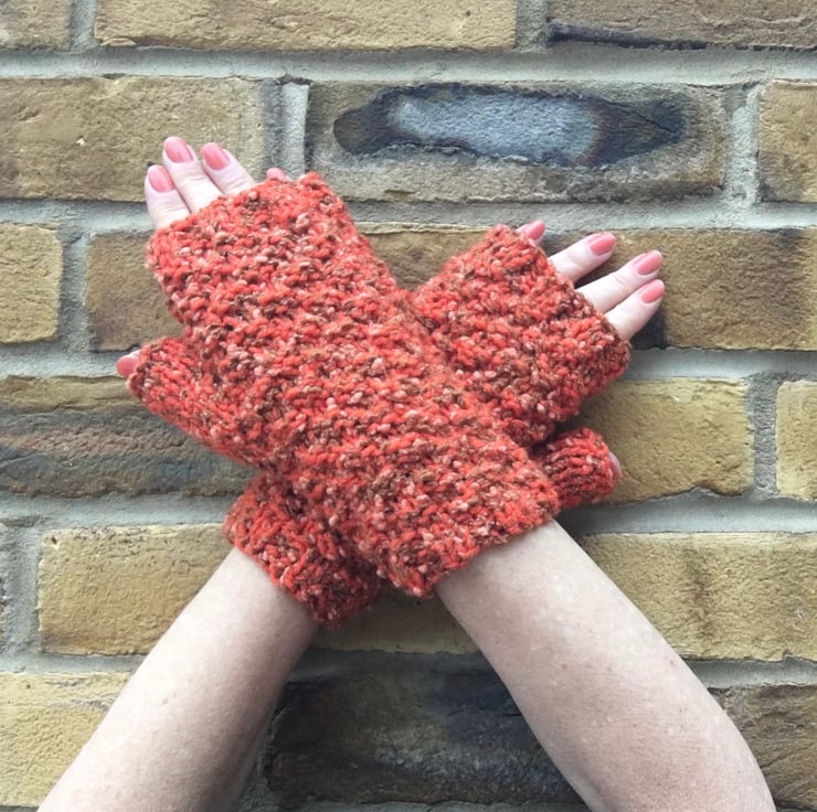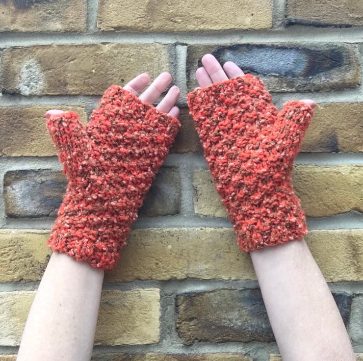 Stay cosy with these charming fingerless mittens, lovingly hand-knitted in a delightful moss stitch. I have mixed the yarns together in rich hues of burnt orange and subtle browns with a beautiful bobble texture to make these wrist warmers unique.