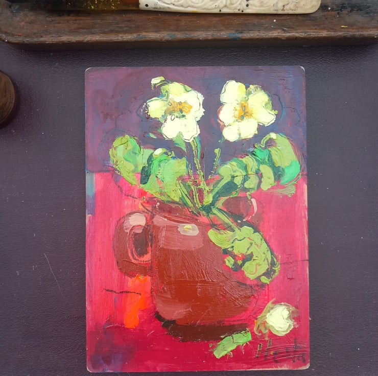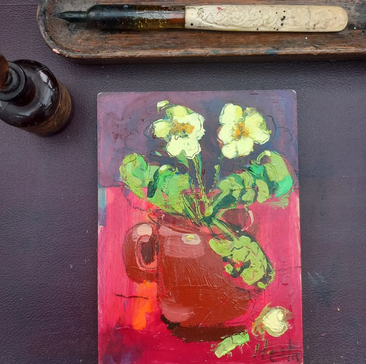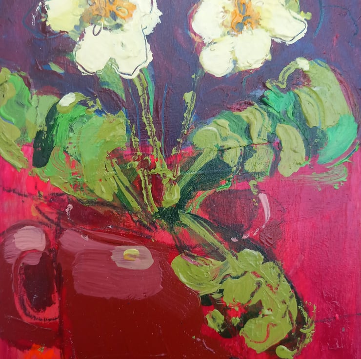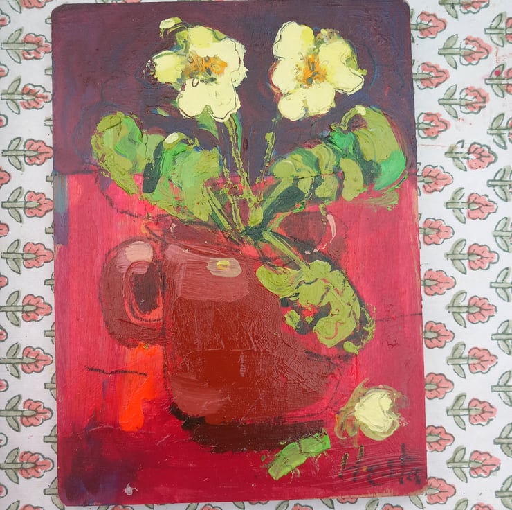 A contemporary still life flower painting, semi abstract and rich in texture. In my signature style. Lightly varnished and ready to hang . The lemon yellow is a pop of spring joy. 18 cm tall. 13 cm wide.