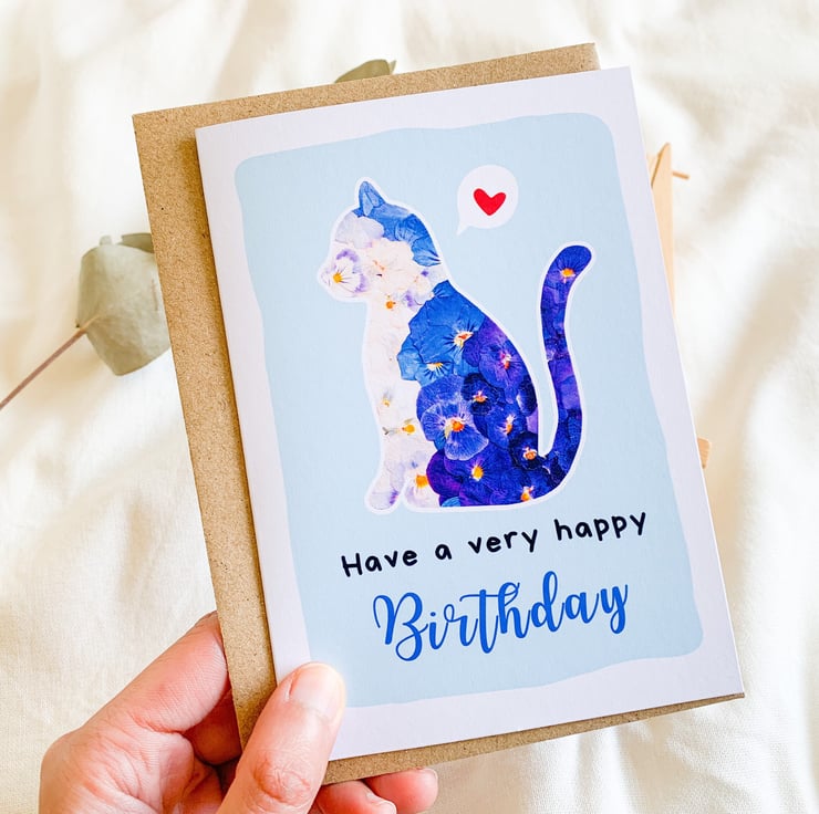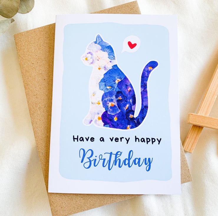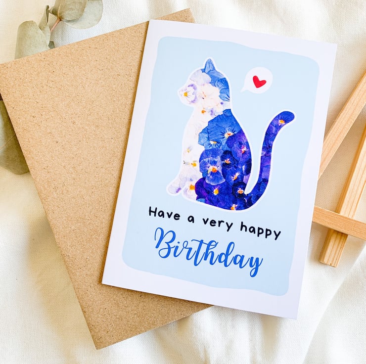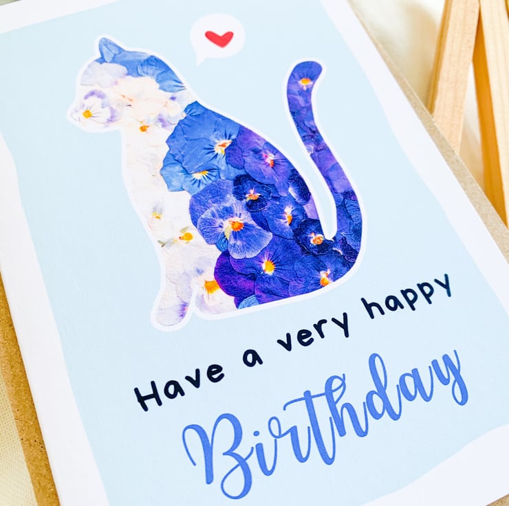 This cute cat birthday card is the perfect way to celebrate a very happy birthday with your loved ones. It features a digital reproduction of my pressed flowers artwork, carefully selected and creatively arranged with love.
