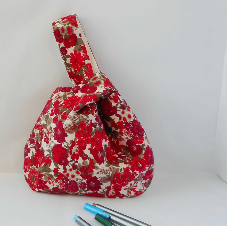 Vintage fabric japanese knot bag in a vibrant red floral print. I believe this fabric is cotton, although it may be a blend.