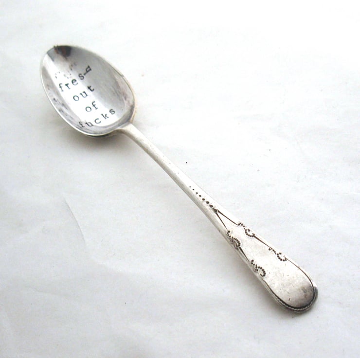 A rude sweary vintage teaspoon hand stamped with 'fresh out of f--ks' in stark contrast to its original rather pretty and delicate engraved detailing on the handle. For when you are really, REALLY done with everything and could absolutely not care less. The spoon is old, battered, scratched and scarred, it has residual tarnish I couldn't be bothered to remove, and to cap it all the very last letter I stamped was sideways because I hadn't been bothered to check whether I'd put it back in the rack the right way up, and of course I hadn't bothered to... kind of sums it up really. Anyway I can't in all honesty pretend it was a deliberate design decision, not this time at least, so it's in the bargain bin for a mere fiver and I hope you or someone you know will enjoy it!