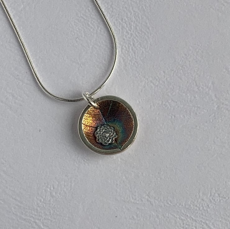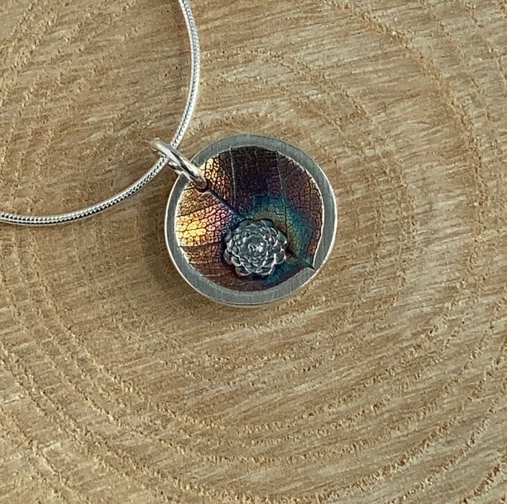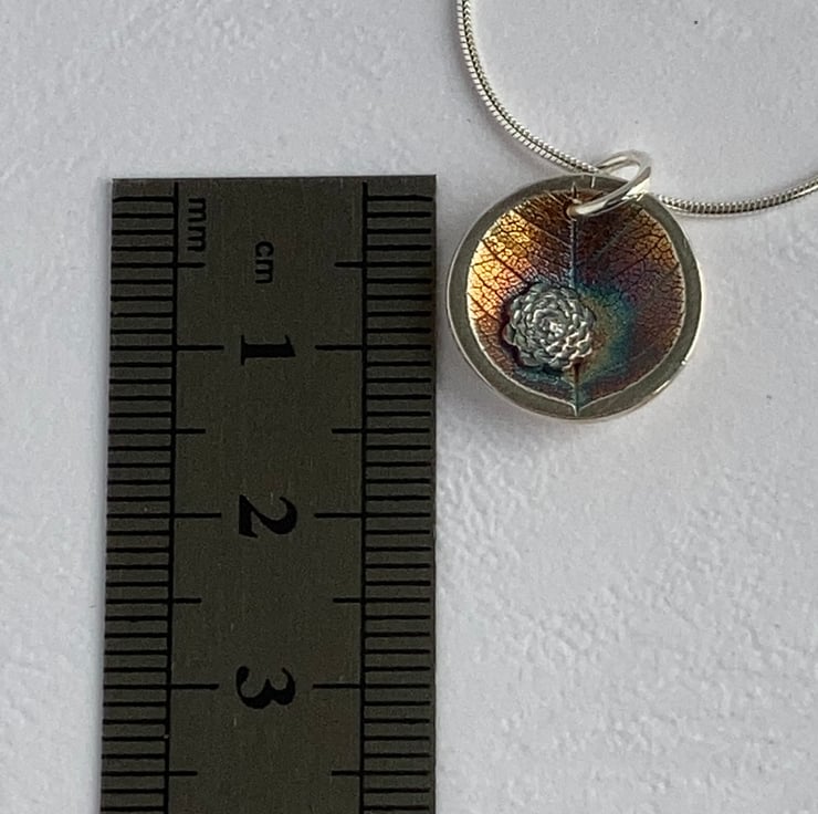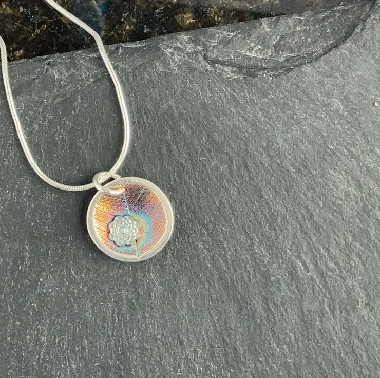 This piece has been oxidised to bring out the detail of the leaf imprint and has produced some gorgeous pinks, greens and blues which add to its unique design.
