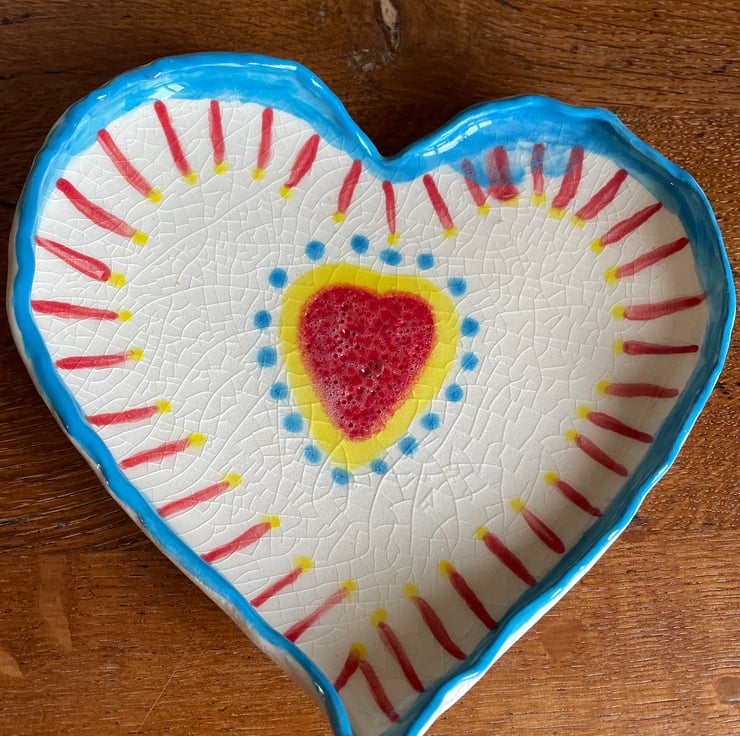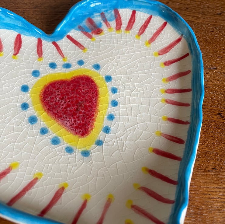 This handcrafted ceramic dish has been created using the slab-work method and shaped into a mould. Once dried it has been bisque fired to 1000C, after a gentle sanding it has been hand-painted with red, sunshine yellow, aquamarine underglazes with a clear glaze added. After glazing it has had a second firing in the kiln to 1160C.